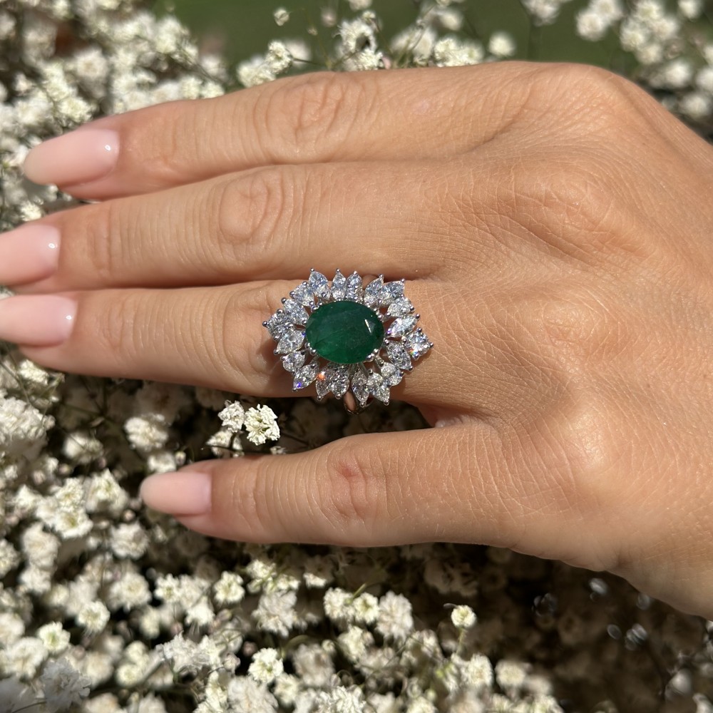 Inel din aur alb de 18K, cu diamante de 2.18 ct si smarald de 3.03 ct. Greutatea inelului este de aproximativ 7.62 grame.