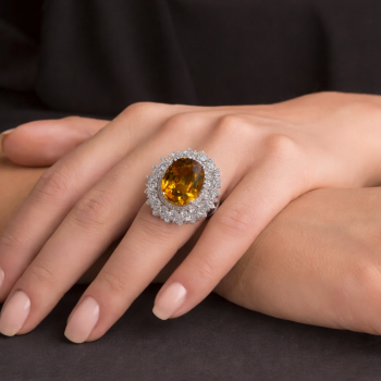 Inel din aur alb de 14 K, cu Safir galben IGSL de 5.53 ct si diamante de 2.22 ct. Greutatea inelului este de 7.93 grame.