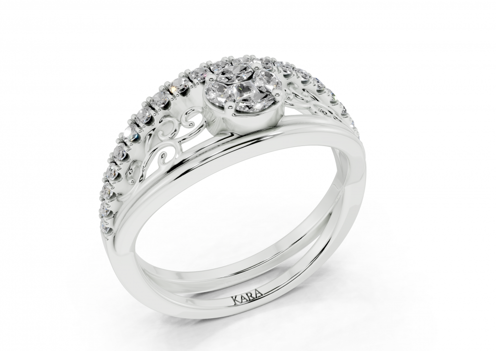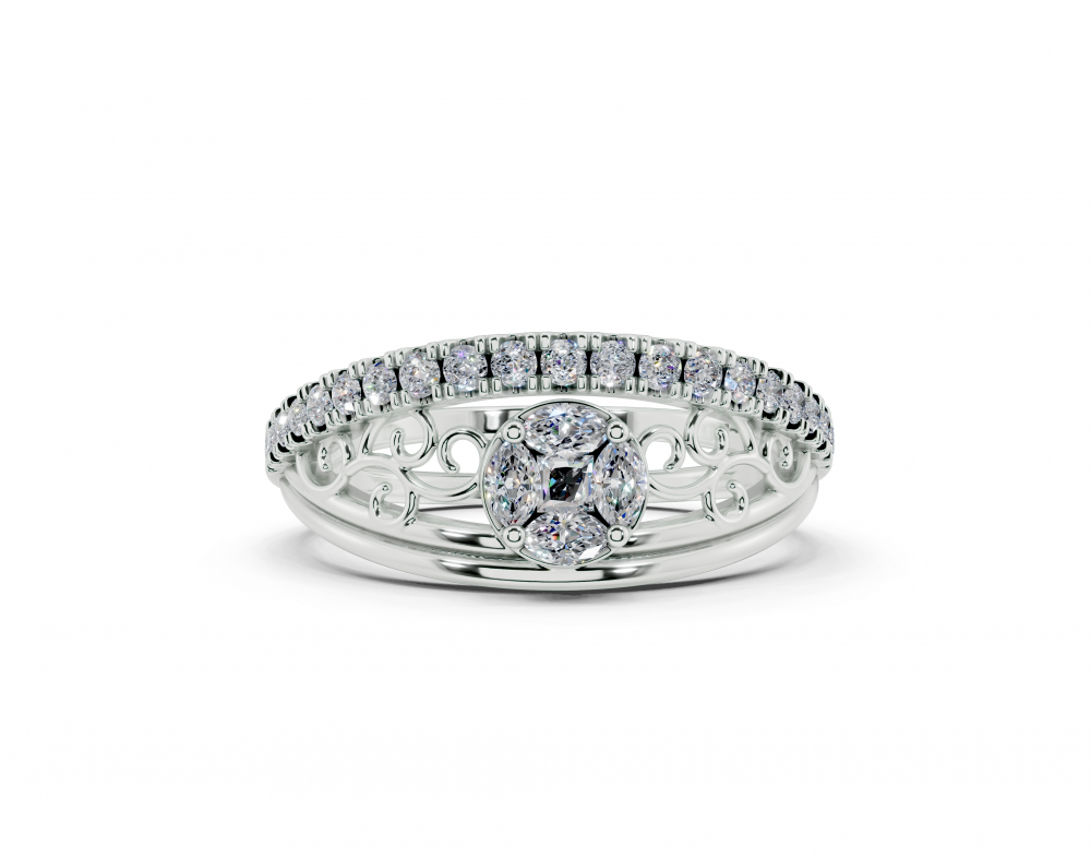 Inel din aur alb de 14K, cu diamante Marquise Cut de 0.10ct, un diamant Princess Cut de 0.05ct si diamante rotunde de 0.21ct. Greutatea inelului este de aproximativ 4.00 grame. Inelul se poate face pe comanda si din aur de 18K. Putem modifica design-ul in functie de bugetul...