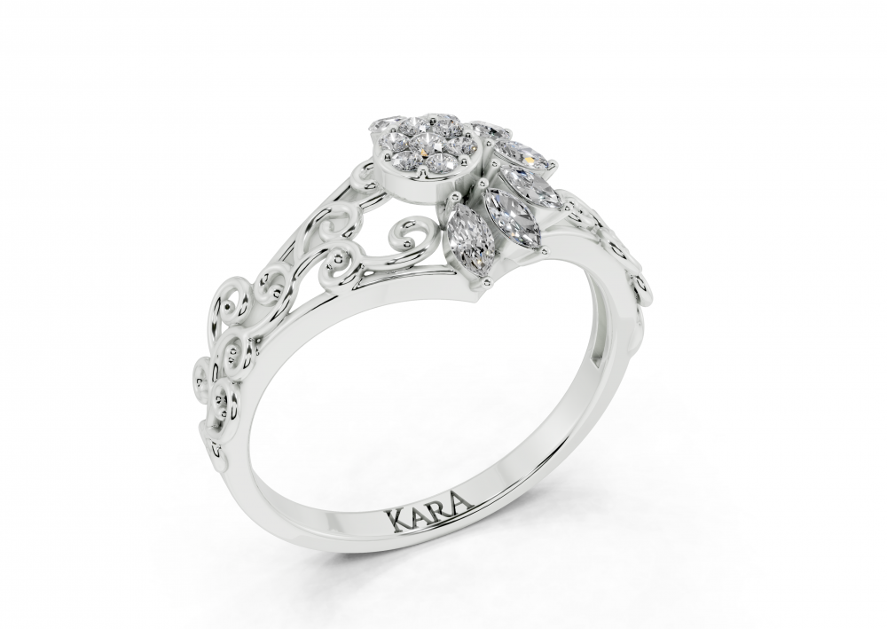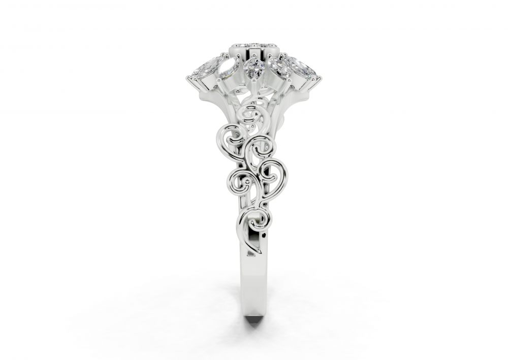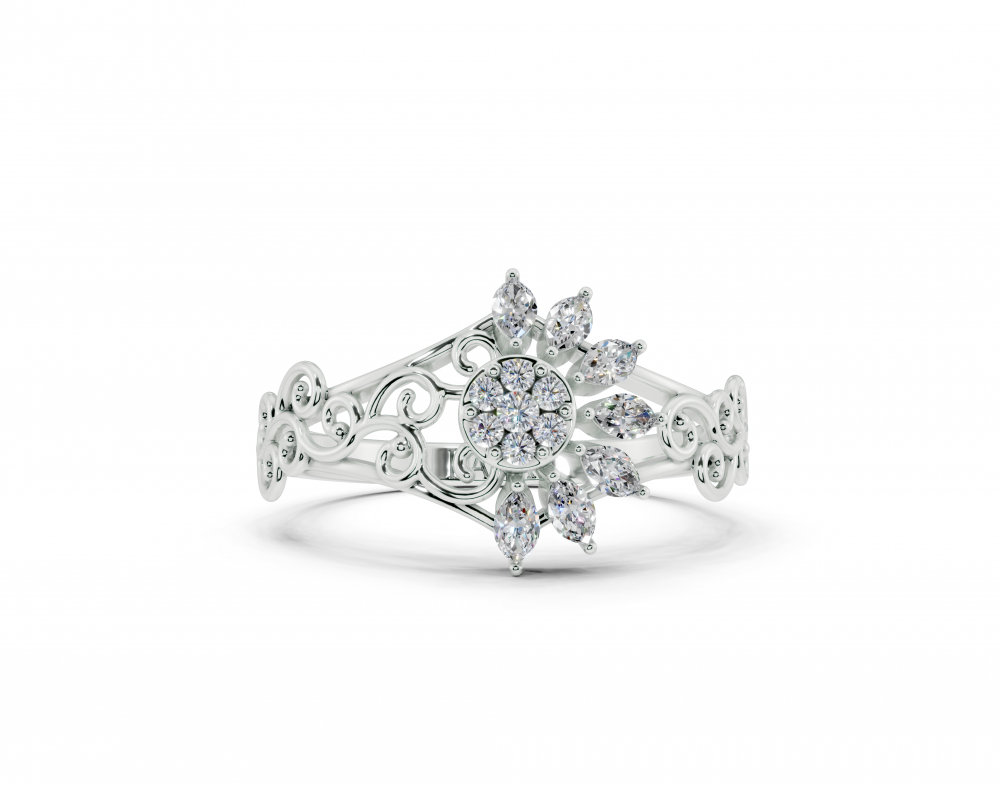 Inel din aur alb de 14K, cu diamante Marquise Cut de 0.16ct si diamante rotunde de 0.05ct. Greutatea inelului este de aproximativ 2.00 grame. Inelul se poate face pe comanda si din aur de 18K. Putem modifica design-ul in functie de bugetul dumneavoastra.