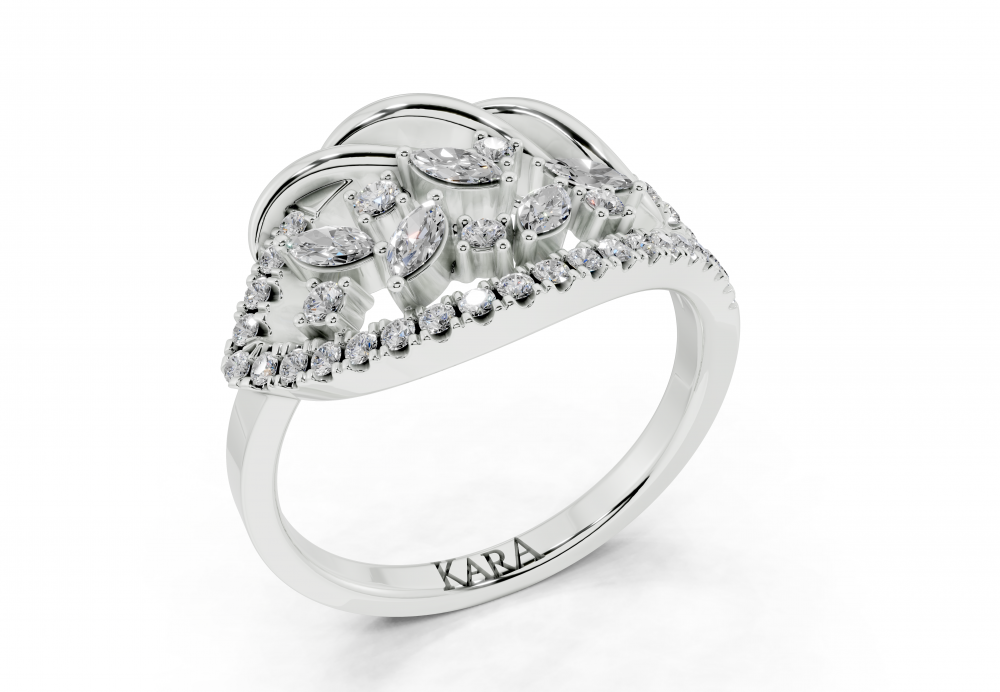 Inel din aur alb de 14K, cu diamante Marquise Cut de 0.17ct si diamante rotunde de 0.24ct. Greutatea inelului este de aproximativ 3.50 grame. Inelul se poate face pe comanda si din aur de 18K. Putem modifica design-ul in functie de bugetul dumneavoastra.