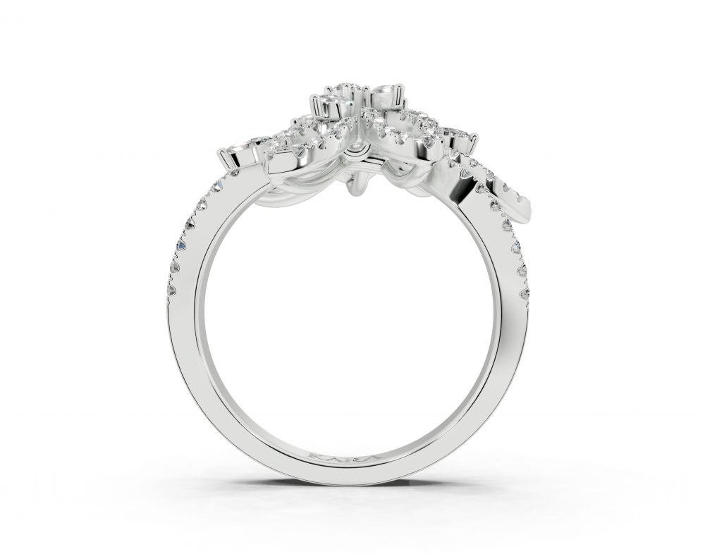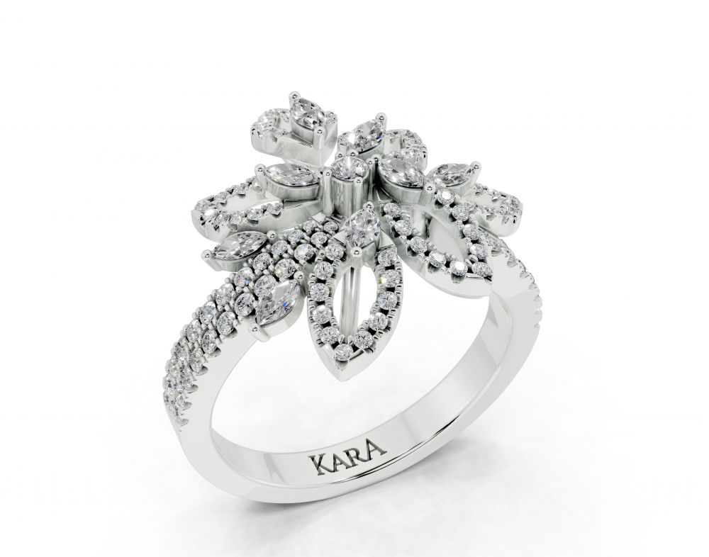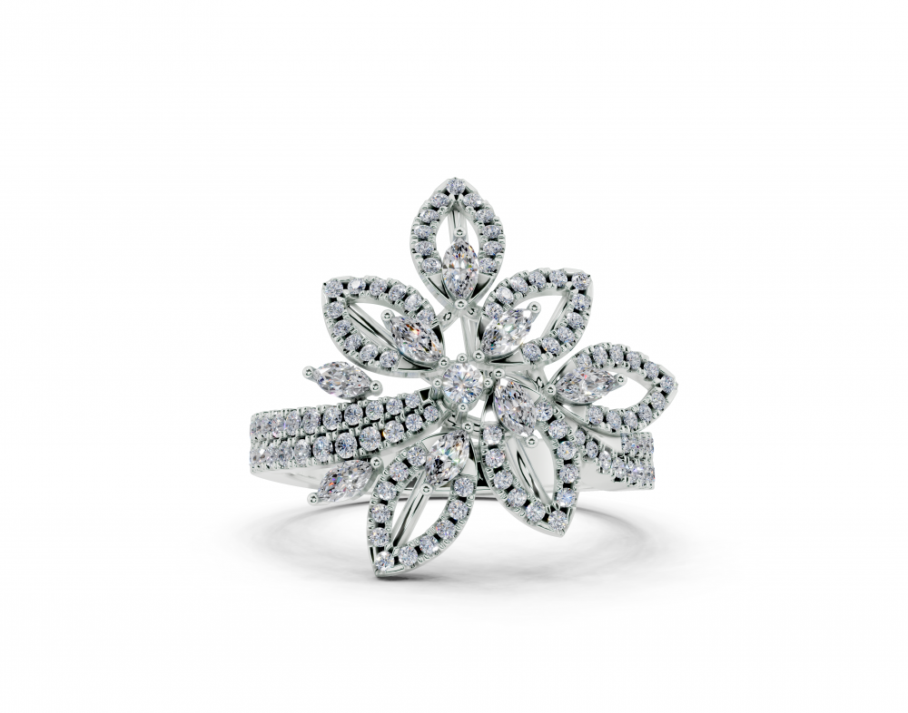 Inel din aur alb de 14K, cu diamante Marquise Cut de 0.19ct. si diamante rotunde de 0.39ct. Greutatea inelului este de aproximativ 4.50 grame.