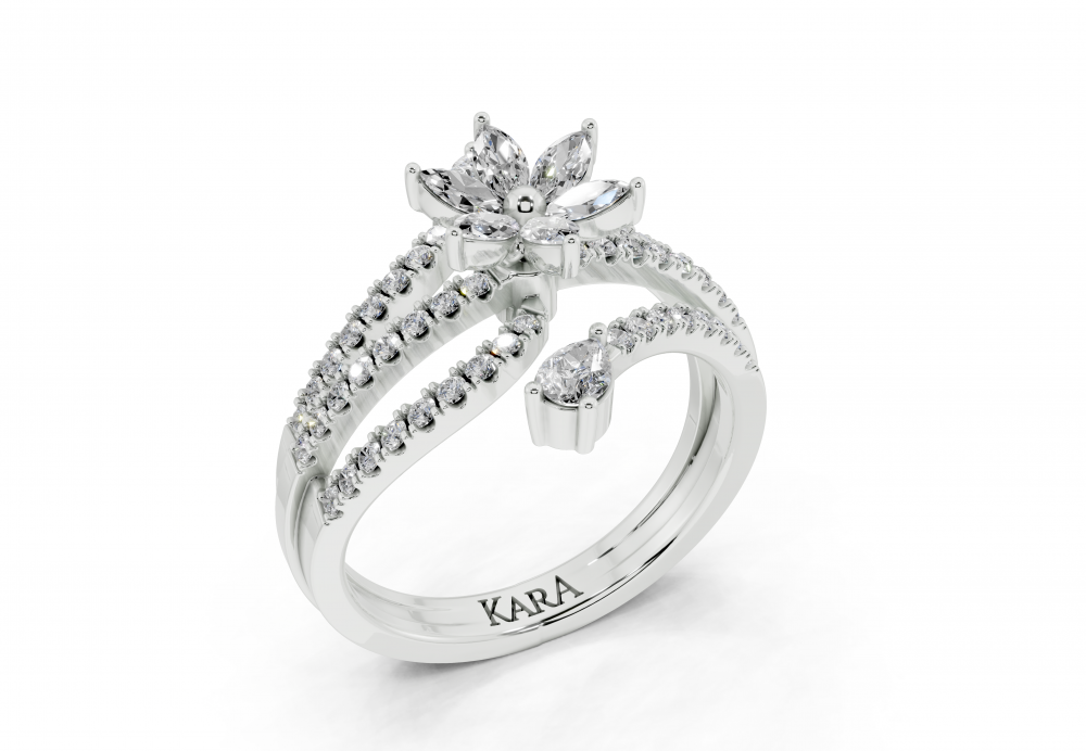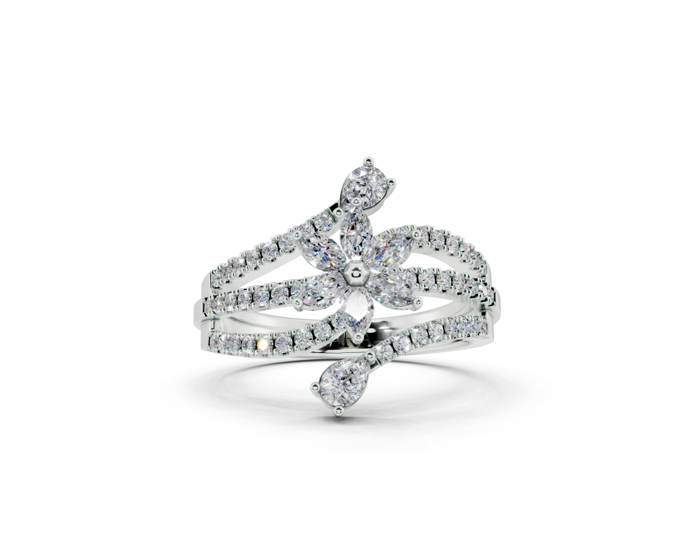 Inel din aur alb de 14K, cu diamante Marquise Cut de 0.22ct, diamante Pear Cut de 0.15ct si diamante rotunde de 0.32ct. Greutatea inelului este de aproximativ 4 grame.