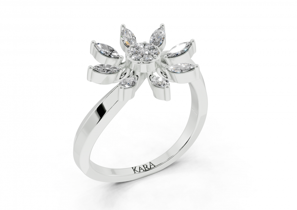 Inel din aur alb de 14K, cu diamante Marquise Cut de 0.28ct si diamante rotunde de 0.05ct. Greutatea inelului este de aproximativ 3.00 grame.