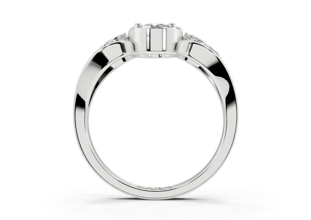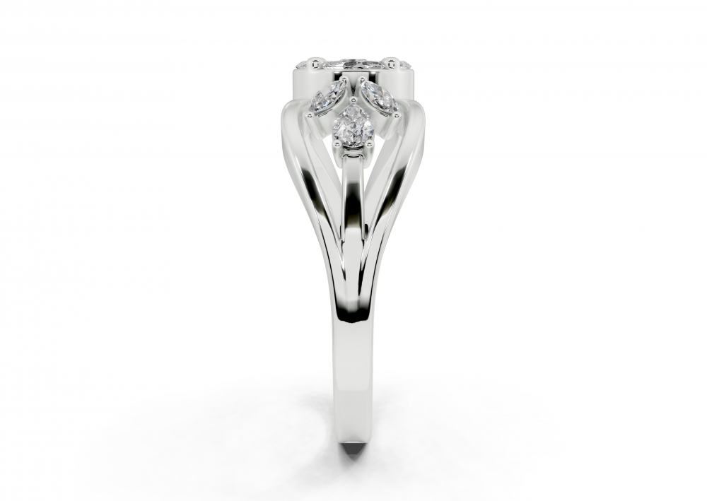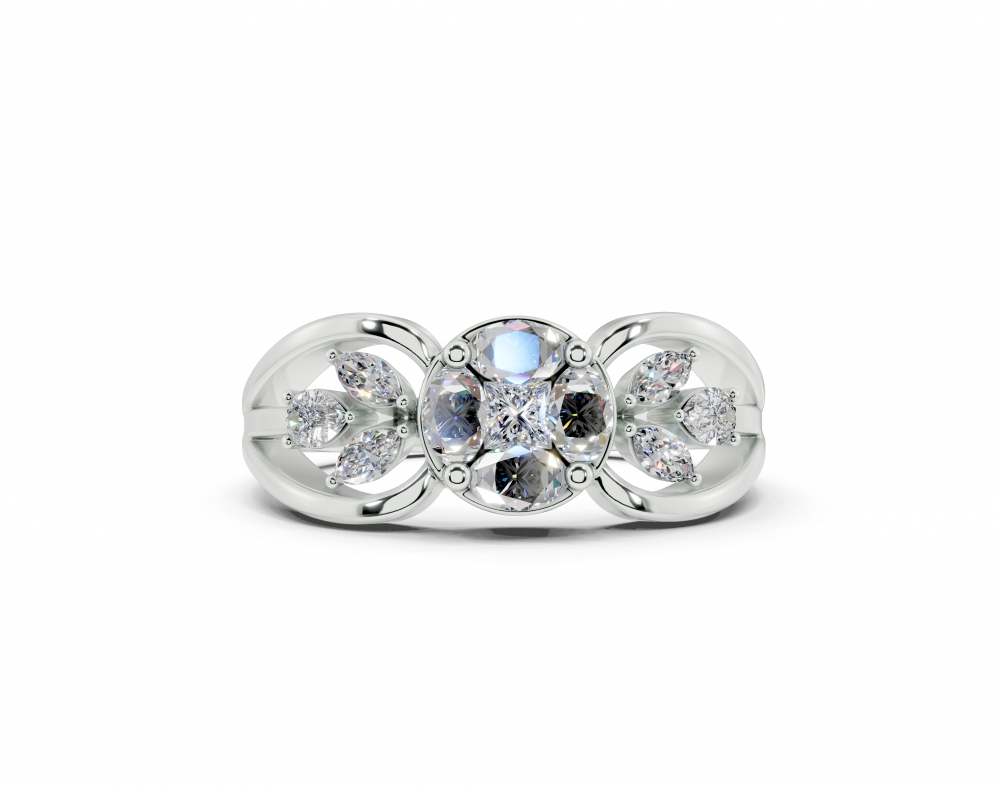 Inel din aur alb de 14K, cu diamante Marquise Cut de 0.30ct, diamante Pear Cut de 0.10ct si diamante Princess Cut de de 0.10ct. Greutatea inelului este de aproximativ 3.50 grame. Inelul se poate face pe comanda si din aur de 18K. Putem modifica design-ul in functie de bugetul dumneavoastra.