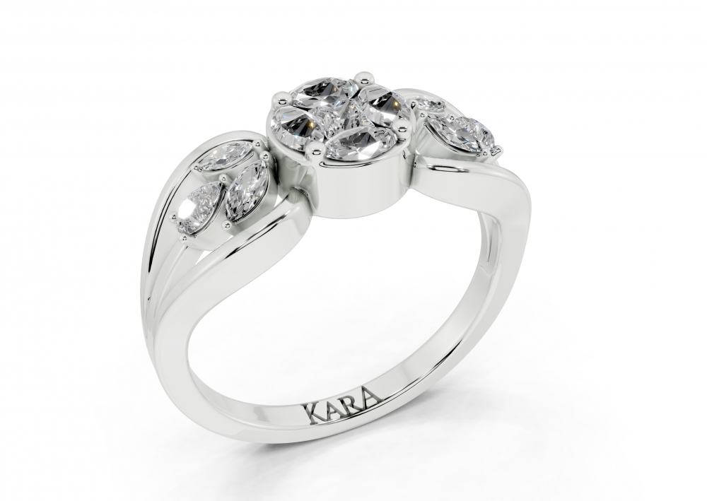 Inel din aur alb de 14K, cu diamante Marquise Cut de 0.30ct, diamante Pear Cut de 0.10ct si diamante Princess Cut de de 0.10ct. Greutatea inelului este de aproximativ 3.50 grame.