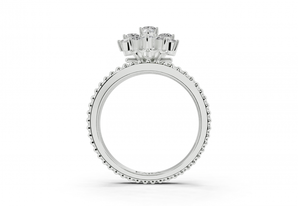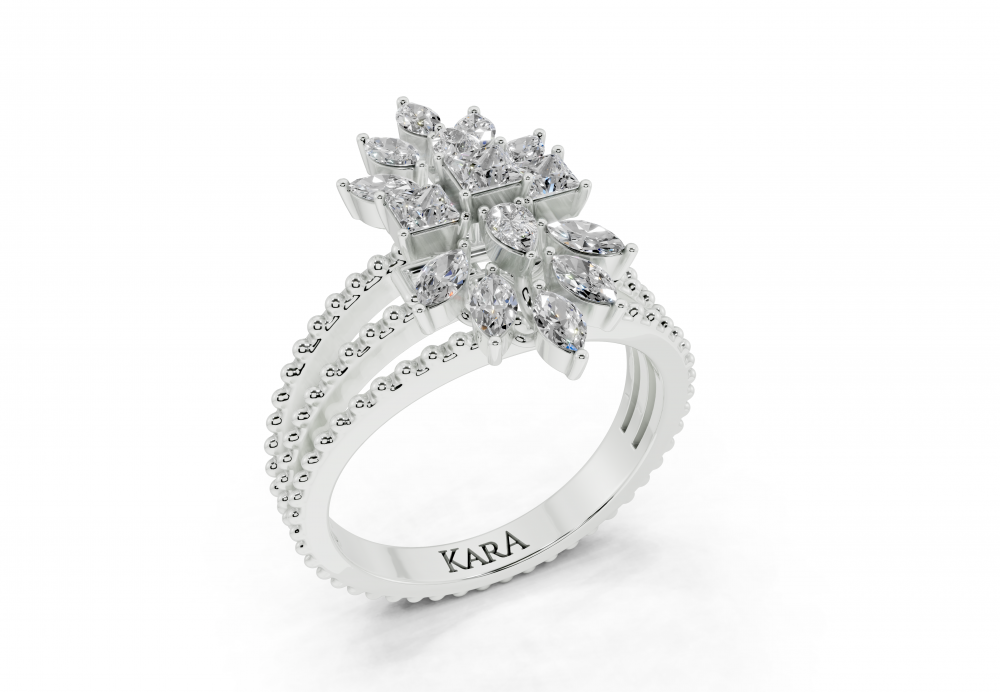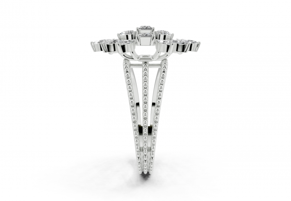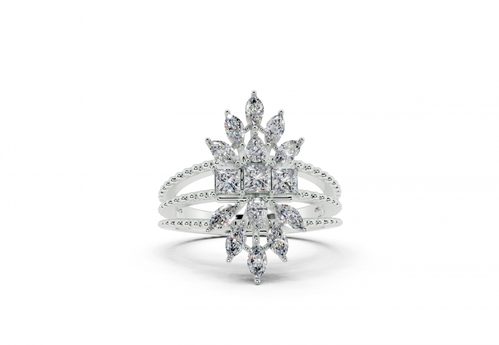 Inel din aur alb de 14K, cu diamante Marquise Cut de 0.37ct, diamante Princess Cut de 0.36ct si diamante Pear Cut de 0.10ct. Greutatea inelului este de aproximativ 6.50 grame. Inelul se poate face pe comanda si din aur de 18K. Putem modifica design-ul in functie de bugetul dumneavoastra.