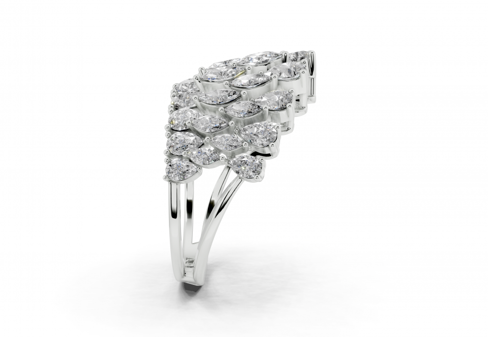 Inel din aur alb de 14K, cu diamante Pear Cut de 1.59ct si diamante Marquise Cut de 0.95ct. Greutatea inelului este de aproximativ 6.50 grame.