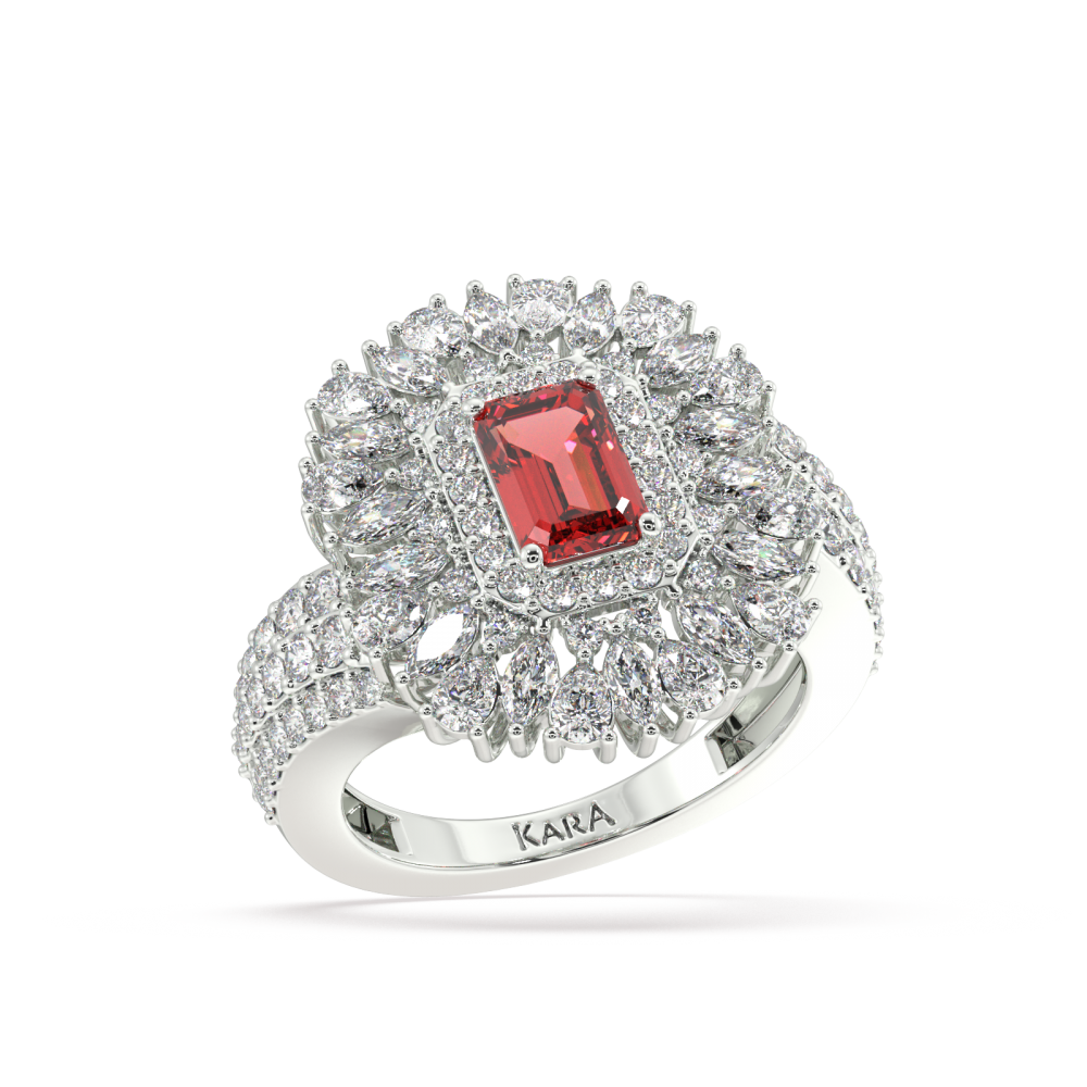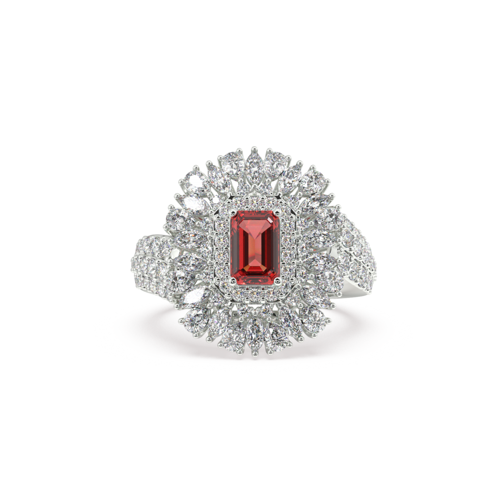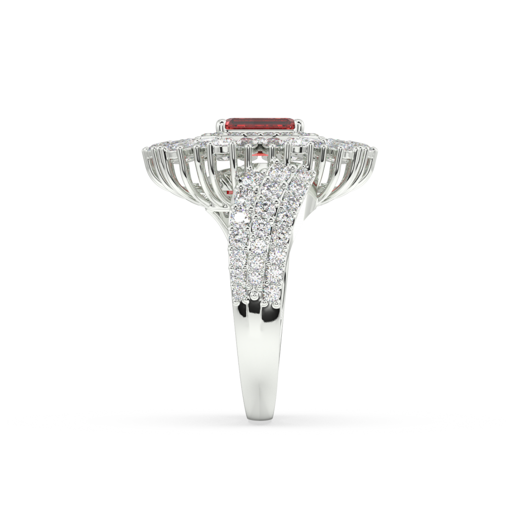 Inel din aur alb de 14K, cu diamante Mix de 0.91 ct si Rubin de 1.81 ct. Greutatea inelului este de aproximativ 6.40 grame.