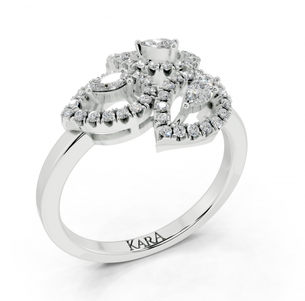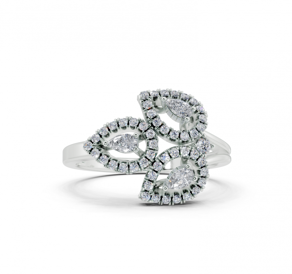 Inel din aur alb de 14K, cu diamante Pear Cut de 0.10 ct si diamante rotunde de 0.20 ct. Greutatea inelului este de aproximativ 3,30 grame.