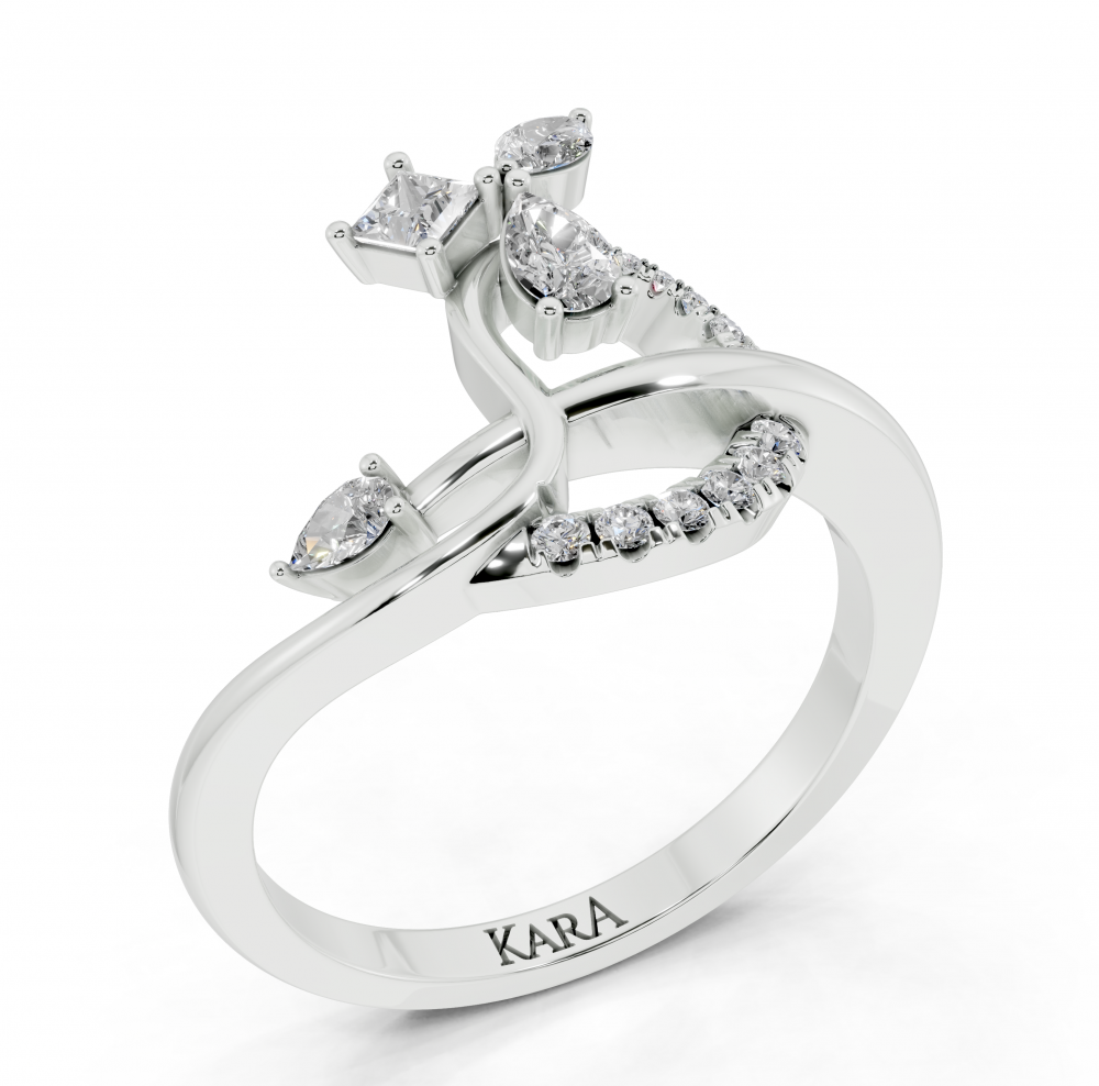 Inel din aur alb de 14K, cu diamante Pear cut de 0,14 ct , Marquise Cut de 0.06 ct, diamante Princess Cut de 0.12 ct si diamante rotunde de 0.06 ct. Greutatea inelului este de aproximativ 3.00 grame.