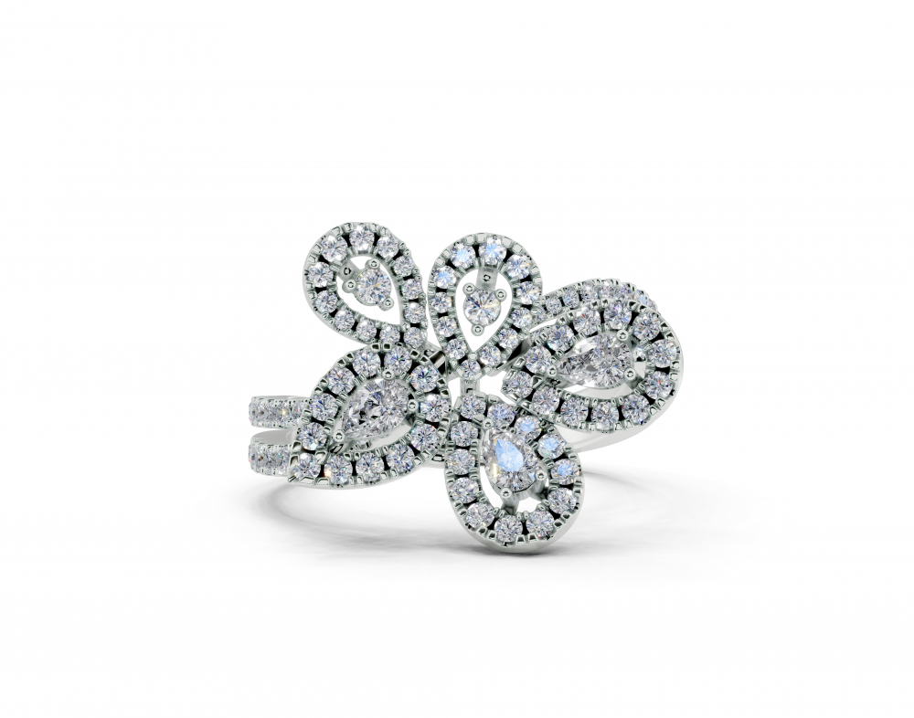 Inel din aur alb de 14K, cu diamante Pear Cut de 0.16ct si diamante rotunde de 0.55ct. Greutatea inelului este de aproximativ 5.50 grame.
