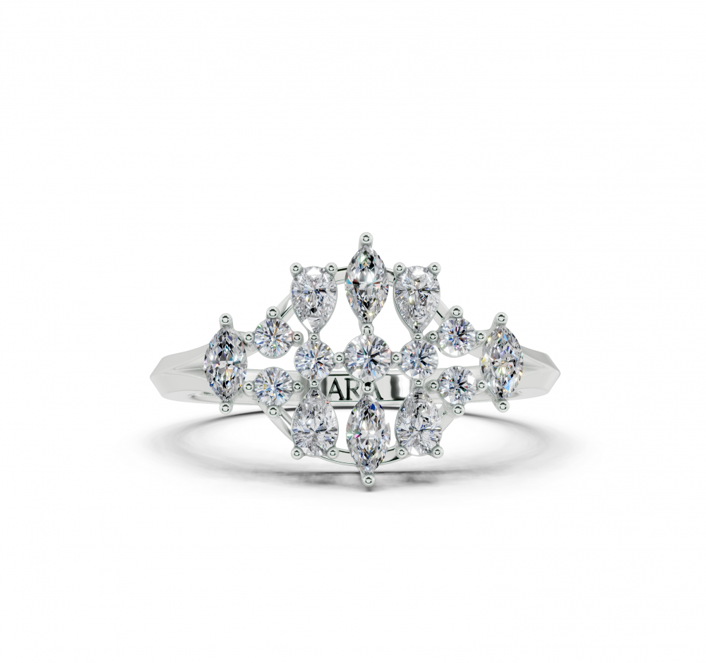 Inel din aur alb de 14K, cu diamante Pear Cut de 0.21ct, diamante Marquise Cut de 0.15ct si diamante rotunde de 0.14ct. Greutatea inelului este de aproximativ 3 grame. Inelul se poate face pe comanda si din aur de 18K. Putem modifica design-ul in functie de bugetul dumneavoastra.