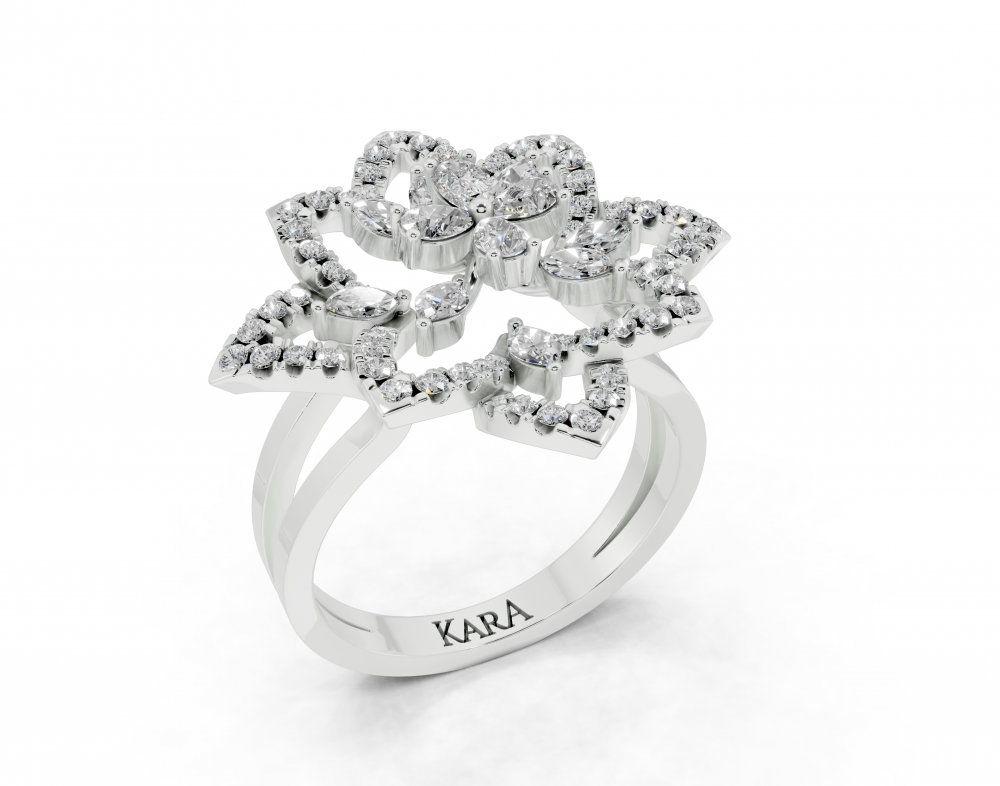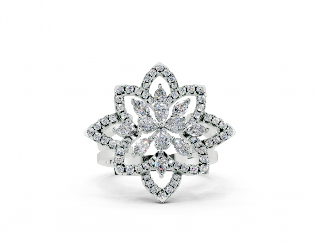 Inel din aur alb de 14K, cu diamante Pear Cut de 0.21ct, diamante Marquise Cut de 0.21ct si diamante rotunde de 0.31ct. Greutatea inelului este de aproximativ 4.50 grame. Inelul se poate face pe comanda si din aur de 18K. Putem modifica design-ul in functie de bugetul dumneavoastra....