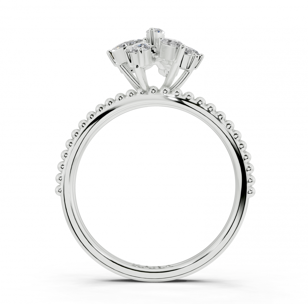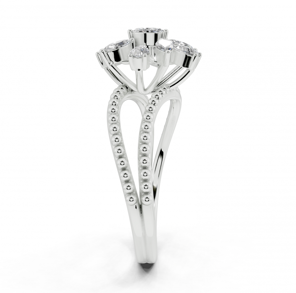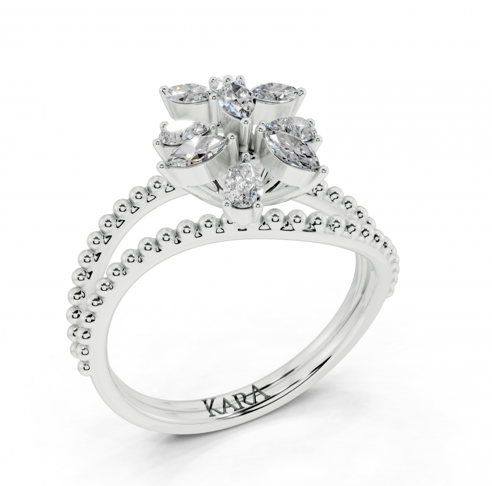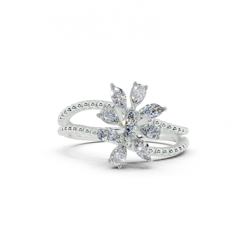 Inel din aur alb de 14K, cu diamante Pear Cut de 0.21ct si diamante Marquise Cut de 0.19ct. Greutatea inelului este de aproximativ 3.50 grame. Inelul se poate face pe comanda si din aur de 18K. Putem modifica design-ul in functie de bugetul dumneavoastra.
