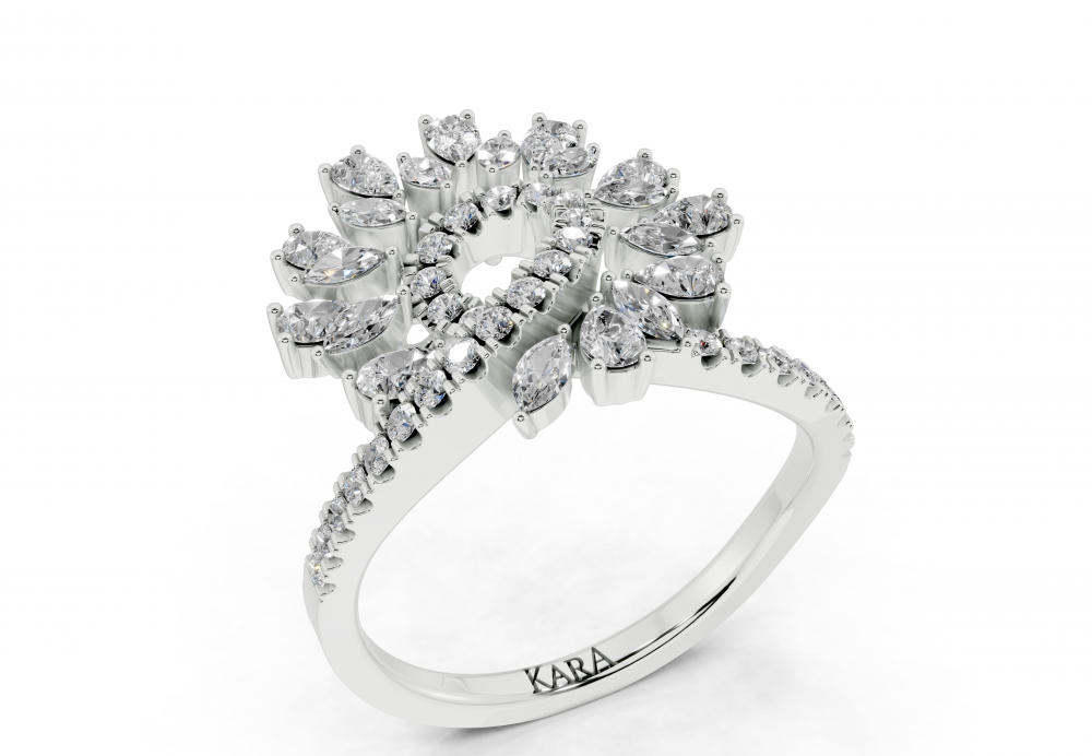 Inel din aur alb de 14K, cu diamante Pear Cut de 0.52ct, diamante Marquise Cut de 0.24ct si diamante rotunde de 0.24ct. Greutatea inelului este de aproximativ 4 grame. Inelul se poate face pe comanda si din aur de 18K. Putem modifica design-ul in functie de bugetul dumneavoastra.