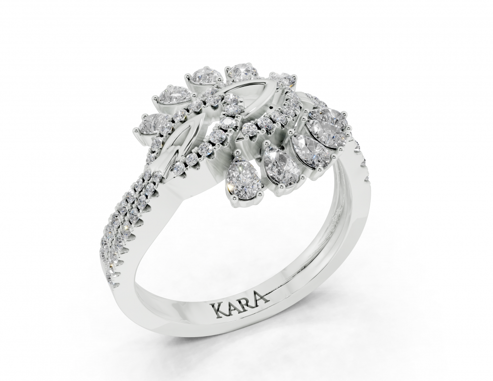 Inel din aur alb de 14K, cu diamante Pear Cut de 0.52ct si diamante rotunde de 0.23ct. Greutatea inelului este de aproximativ 4 grame.