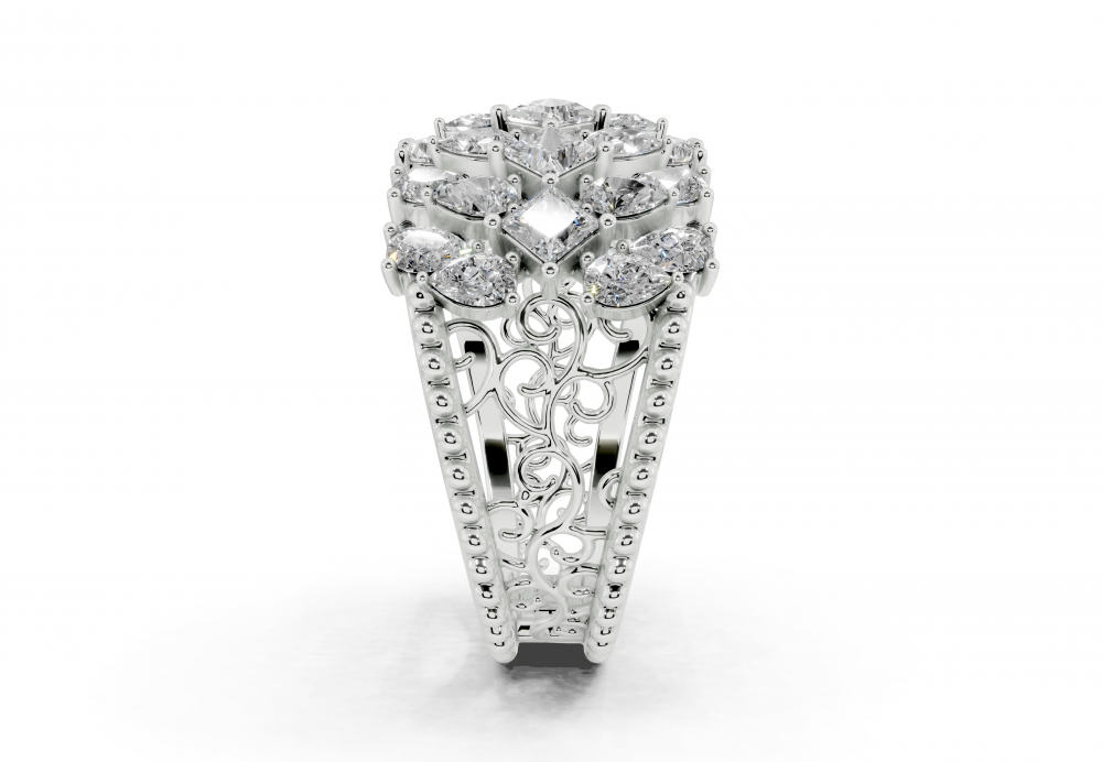 Inel din aur alb de 14K, cu diamante Pear Cut de 1.35ct si diamante Princess Cut de 0.70ct. Greutatea inelului este de aproximativ 5 grame. Inelul se poate face pe comanda si din aur de 18K. Putem modifica design-ul in functie de bugetul dumneavoastra.