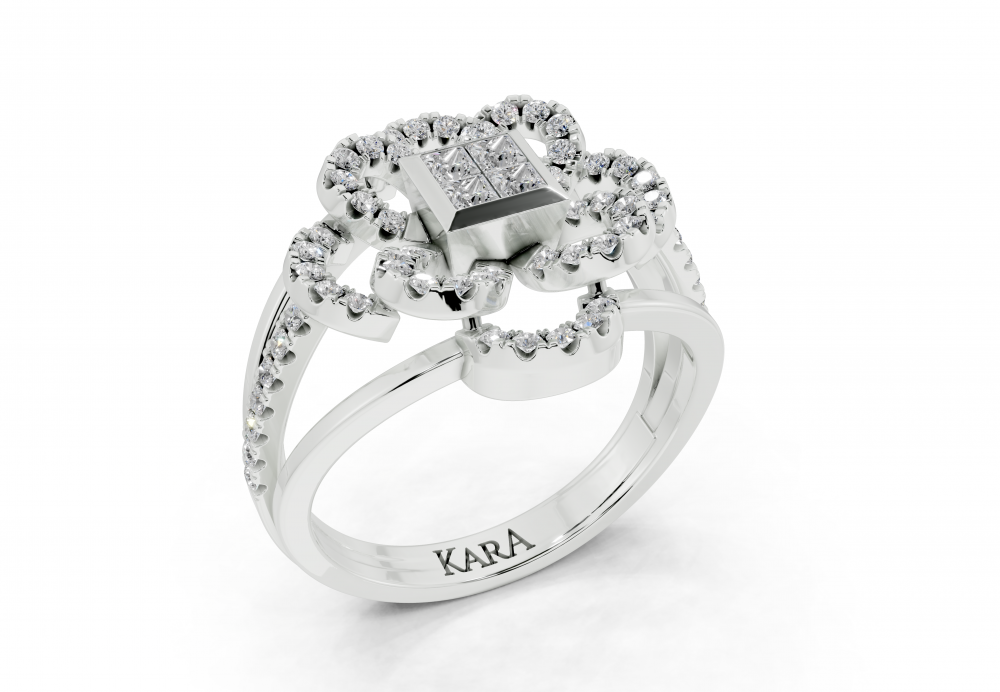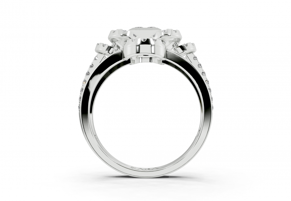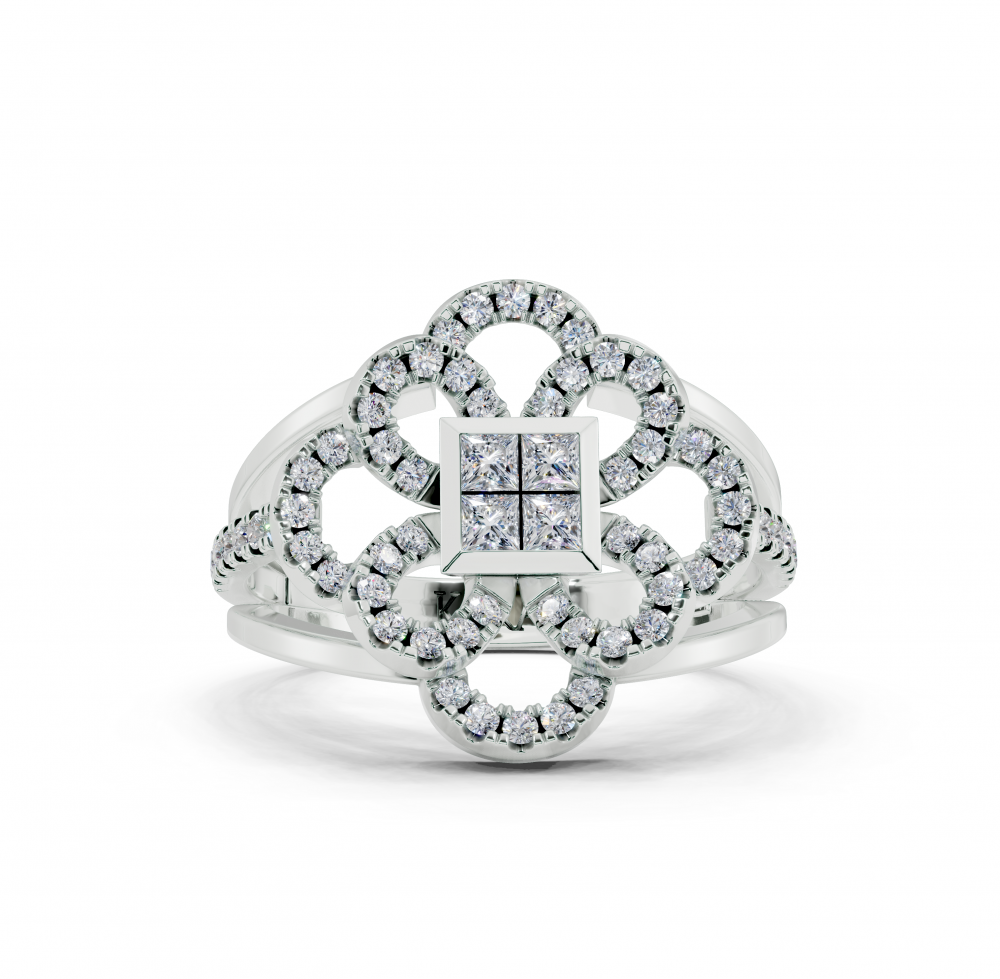 Inel din aur alb de 14K, cu diamante Princess Cut de 0.16ct si diamante rotunde de 0.33ct. Greutatea inelului este de aproximativ 4.50 grame.