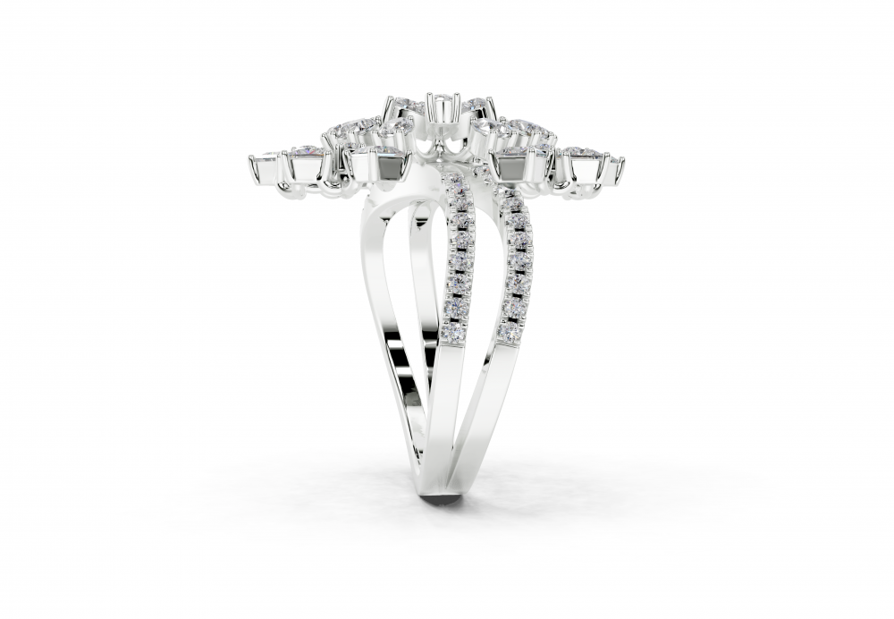 Inel din aur alb de 14K, cu diamante Princess Cut de 0.85ct, diamante Pear Cut de 0.72ct si diamante rotunde de 0.33ct. Greutatea inelului este de aproximativ 5 grame. Inelul se poate face pe comanda si din aur de 18K. Putem modifica design-ul in functie de bugetul dumneavoastra.