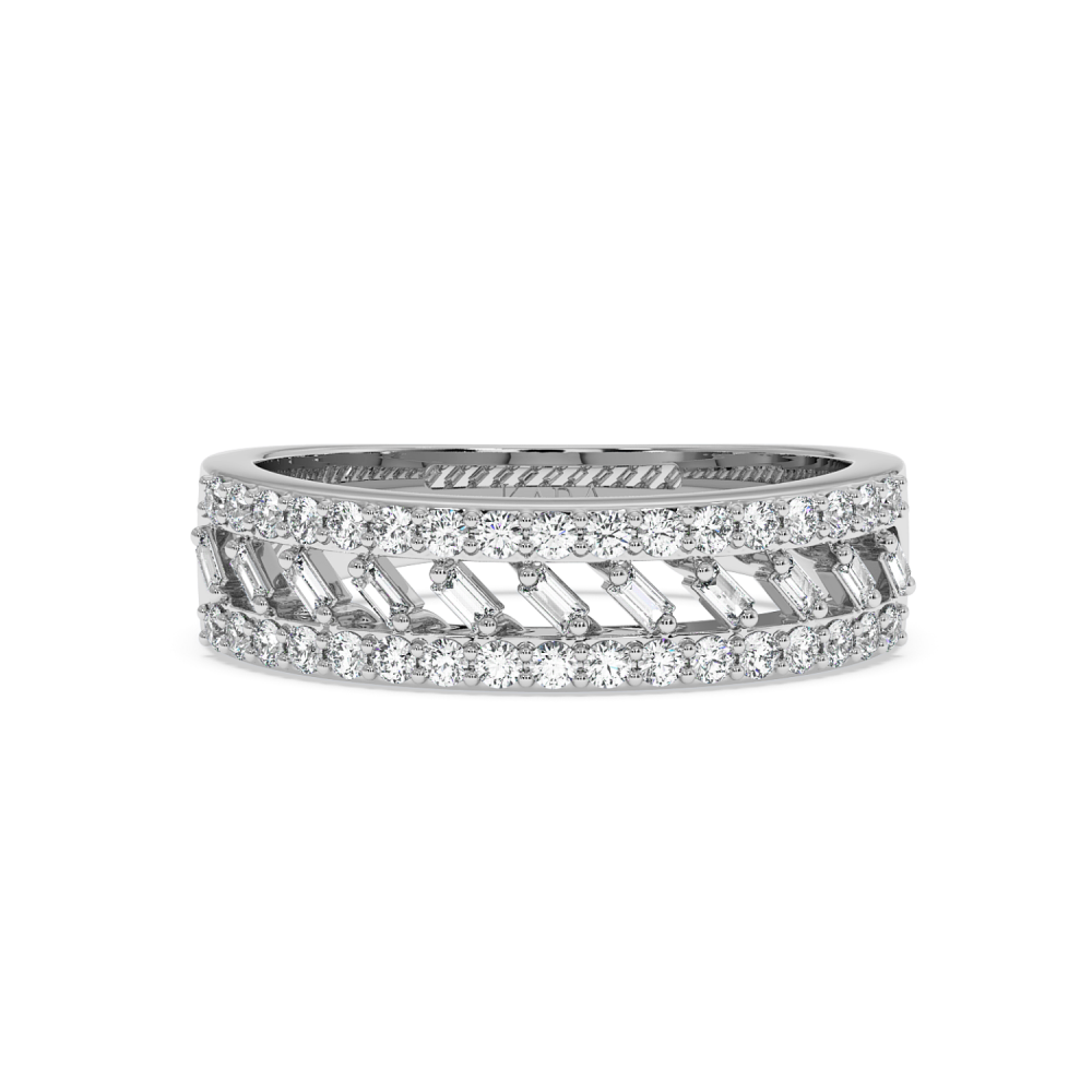 Inel din aur alb de 14 K, cu diamante rotunde  de 0.37 ct si diamante Baget de 0.11 ct. Greutatea inelului este de 4.64 grame.