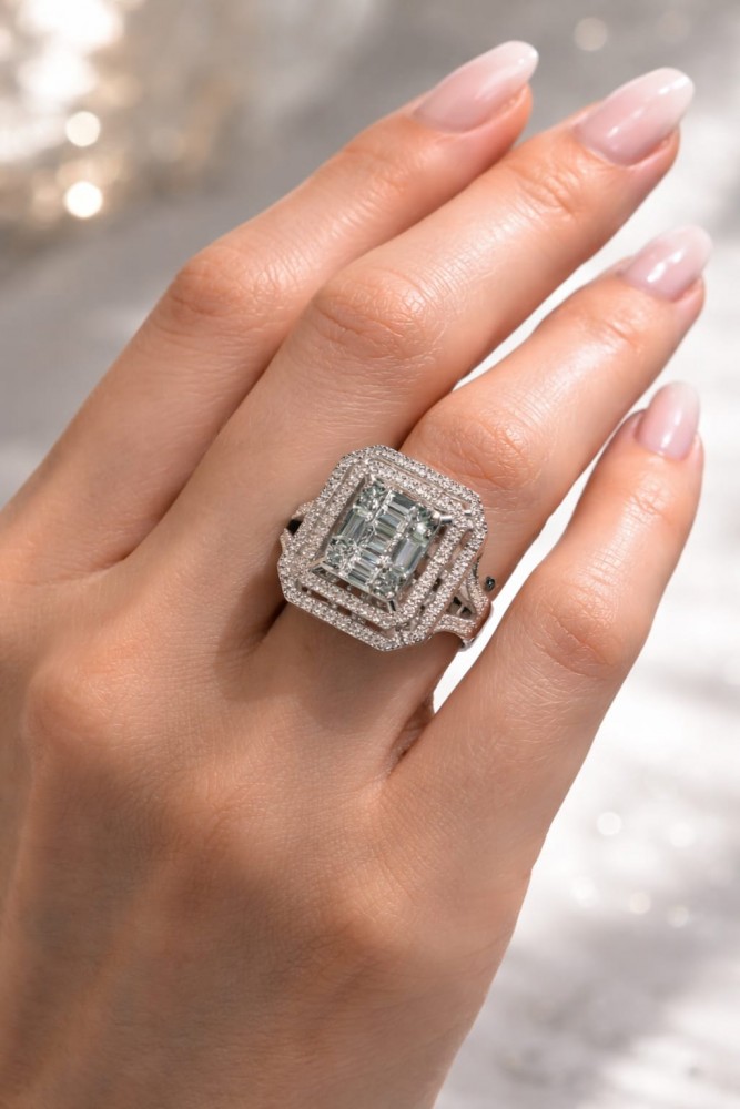 Inel din aur alb de 14K, cu diamante rotunde de 0.62 ct si diamante Baget de 0.42 ct. Greutatea inelului este de 5.57 grame. Putem modifica design-ul in functie de bugetul dumneavoastra. Putem alege caracteristicile diamantelor (taietura, culoarea, claritate, carate) pentru a crea...