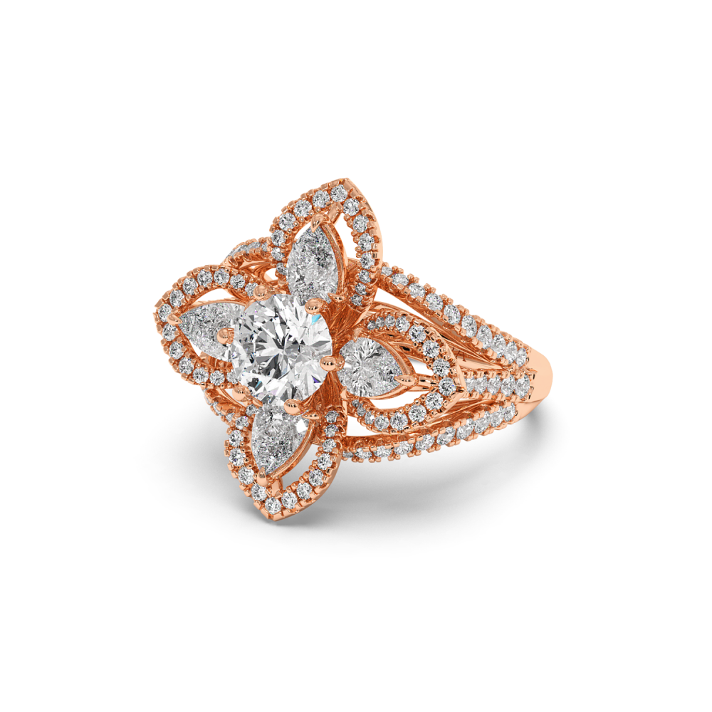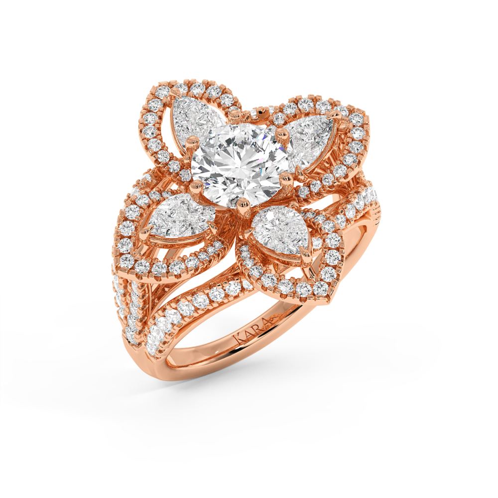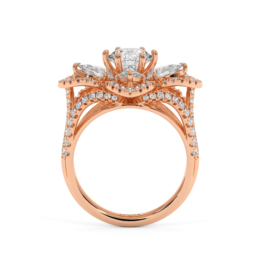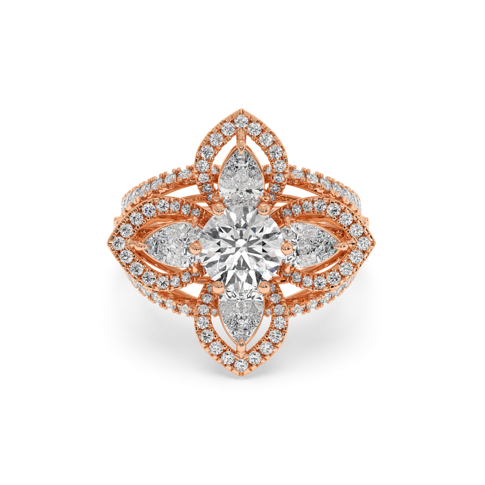 Inel din aur de 14K, cu diamante rotunde de 1.79 ct si diamante Pear cut de 0.85 ct. Greutatea inelului este de aproximativ 6.03 grame. Gramajele si caratajele sunt aproximative. Inelul se poate face pe comanda si din aur de 18K. Putem modifica designul in functie de bugetul dumneavoastra.