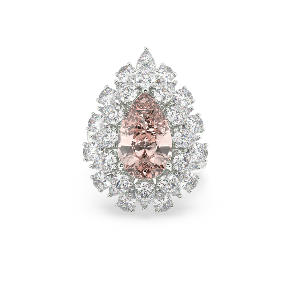 Inel din aur alb de 14K, cu Morganite Pear Cut central de 3.75ct si diamante Pear Cut laterale de 3.33ct. Greutatea inelului este de aproximativ 8.30 grame.