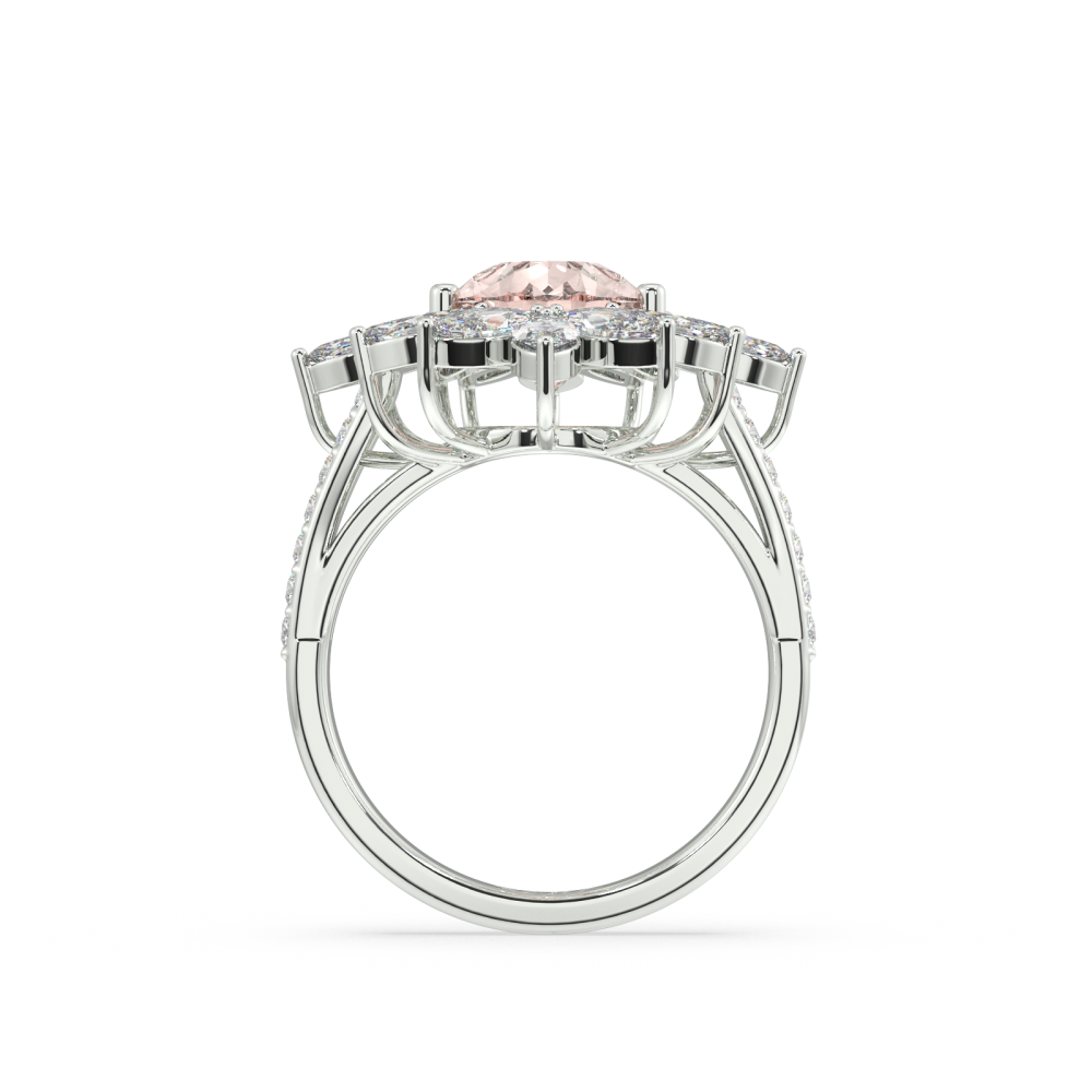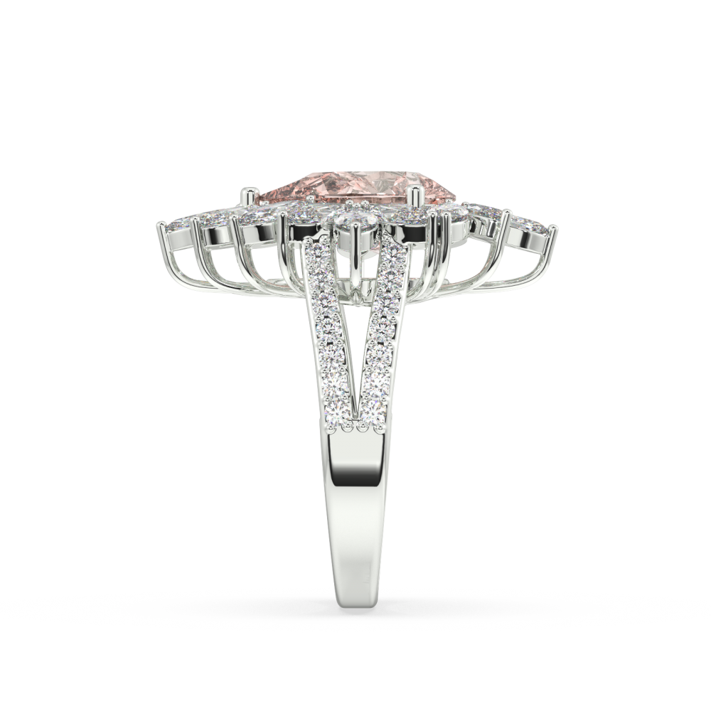 Inel din aur alb de 14K, cu Morganite Pear Cut central de 2.41ct si diamante Pear Cut laterale de 1.62ct. Greutatea inelului este de aproximativ 6.20 grame.