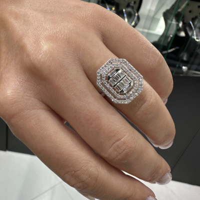 Inel din aur alb de 14 K, cu Safire roz de 1.85 ct si diamante de 0.49 ct. Greutatea inelului este de aproximativ 4.48 grame.