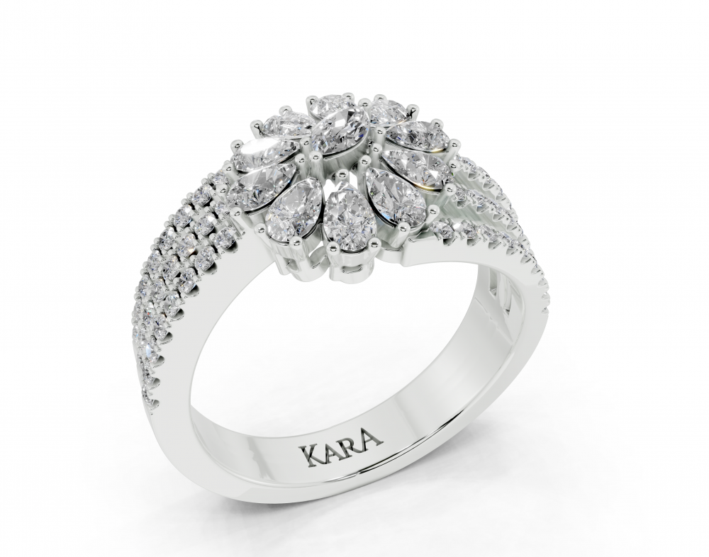 Inel din aur alb de 14K, cu un diamant Marquise Cut de 0.06ct, diamante Pear Cut de 0.66ct si diamante rotunde de 0.33ct. Greutatea inelului este de aproximativ 5 grame. Inelul se poate face pe comanda si din aur de 18K. Putem modifica design-ul in functie de bugetul dumneavoastra....