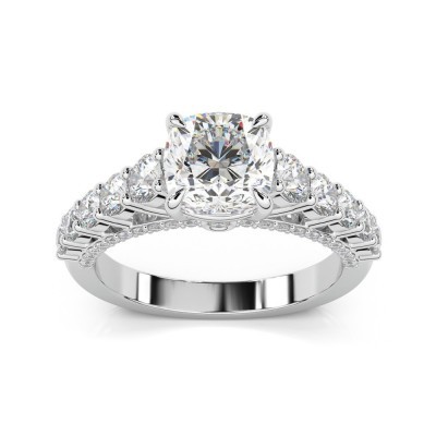 Inel din aur alb de 14 K, cu diamant central Cushion de 1.70 ct cu certificat HRD si diamante laterale de 1.16 ct. Greutatea inelului este de 4.78 grame. Putem modifica design-ul in functie de bugetul dumneavoastra. Putem alege caracteristicile diamantelor (taietura, culoarea,...