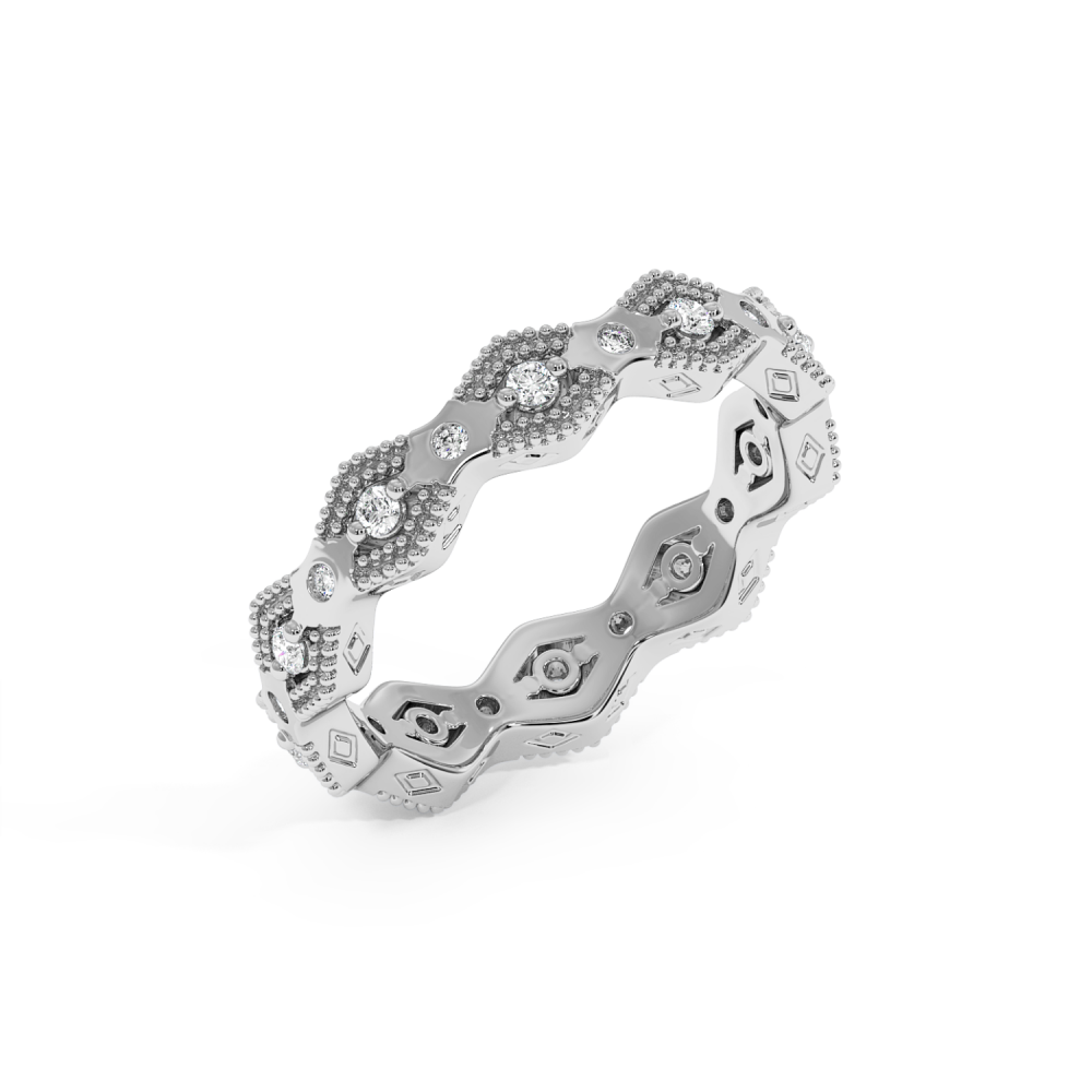 Inelul/Verigheta Eternity din aur alb de 14 K cu diamante de 0.3 ct. Greutatea este de 3.43 grame. Se poate face pe comanda si din aur de 18K. Putem modifica designul in functie de bugetul dumneavoastra. Putem alege caracteristicile diamantelor (taietura, culoarea, claritate).