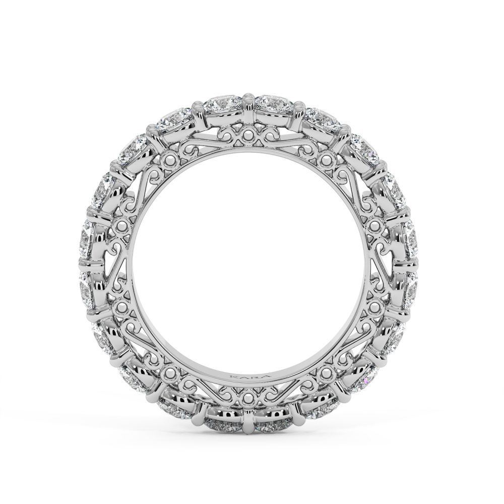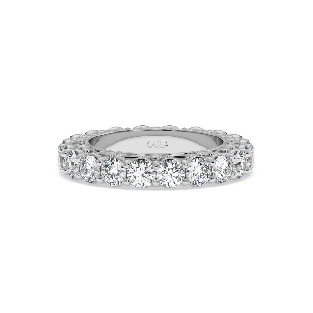 Inelul/Verigheta Eternity din aur alb de 14 K cu diamante de 3.4ct. Greutatea este de 7.50 grame. Se poate face pe comanda si din aur de 18K. Putem modifica designul in functie de bugetul dumneavoastra. Putem alege caracteristicile diamantelor (taietura, culoarea, claritate).