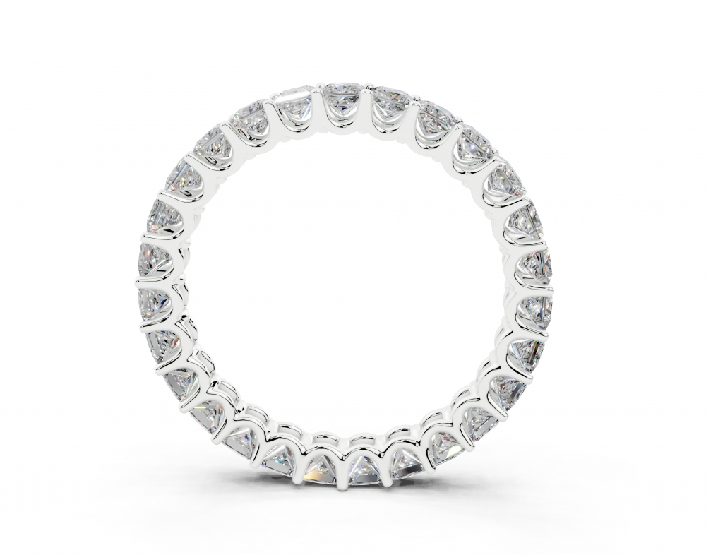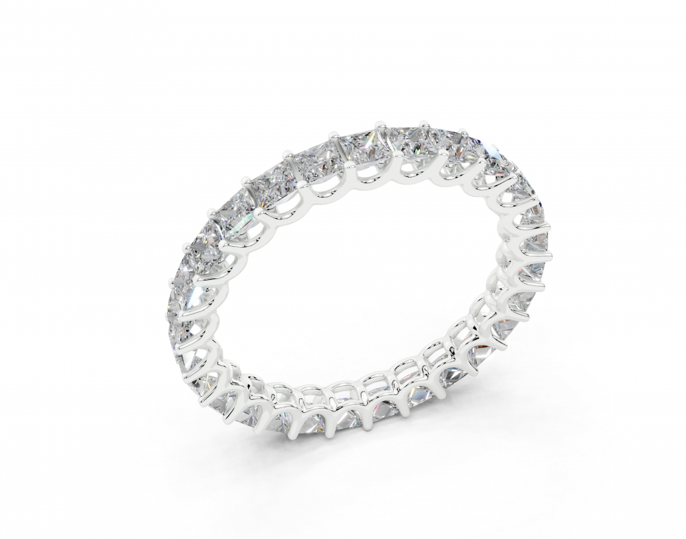 Inelul/Verigheta Eternity din aur alb de 14 K cu diamante Princess Cut de 1.93ct. Greutatea aproximativa este de 2 grame. Se poate face pe comanda si din aur de 18K. Putem modifica design-ul in functie de bugetul dumneavoastra. Putem alege caracteristicile diamantelor (taietura, culoarea,...