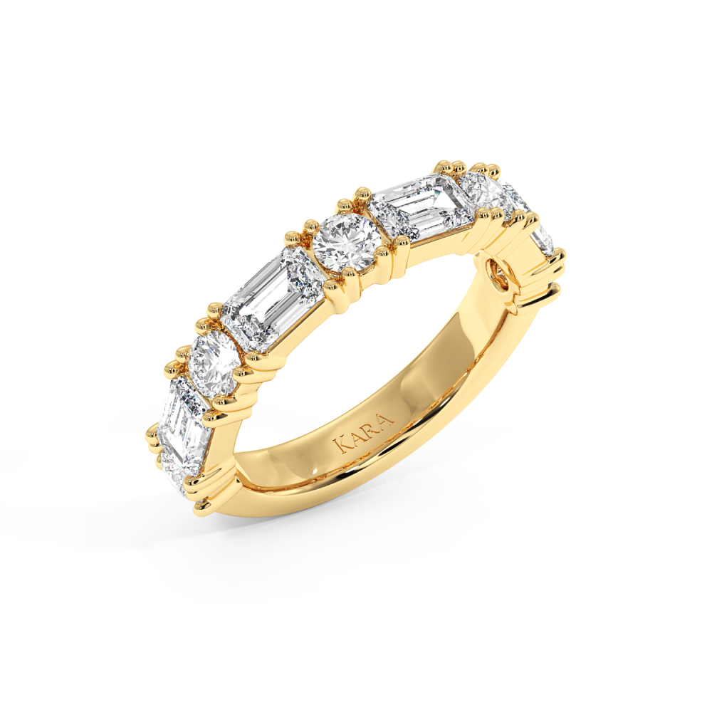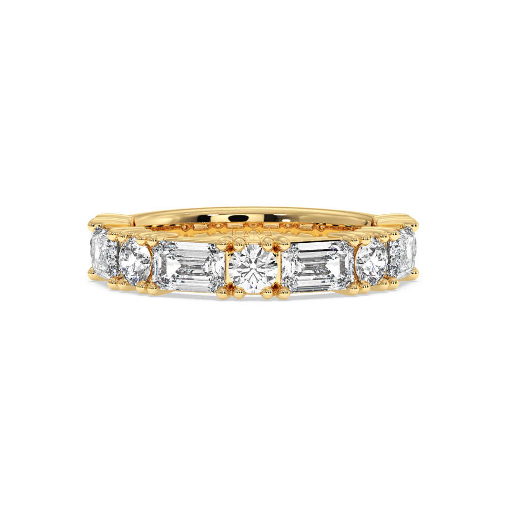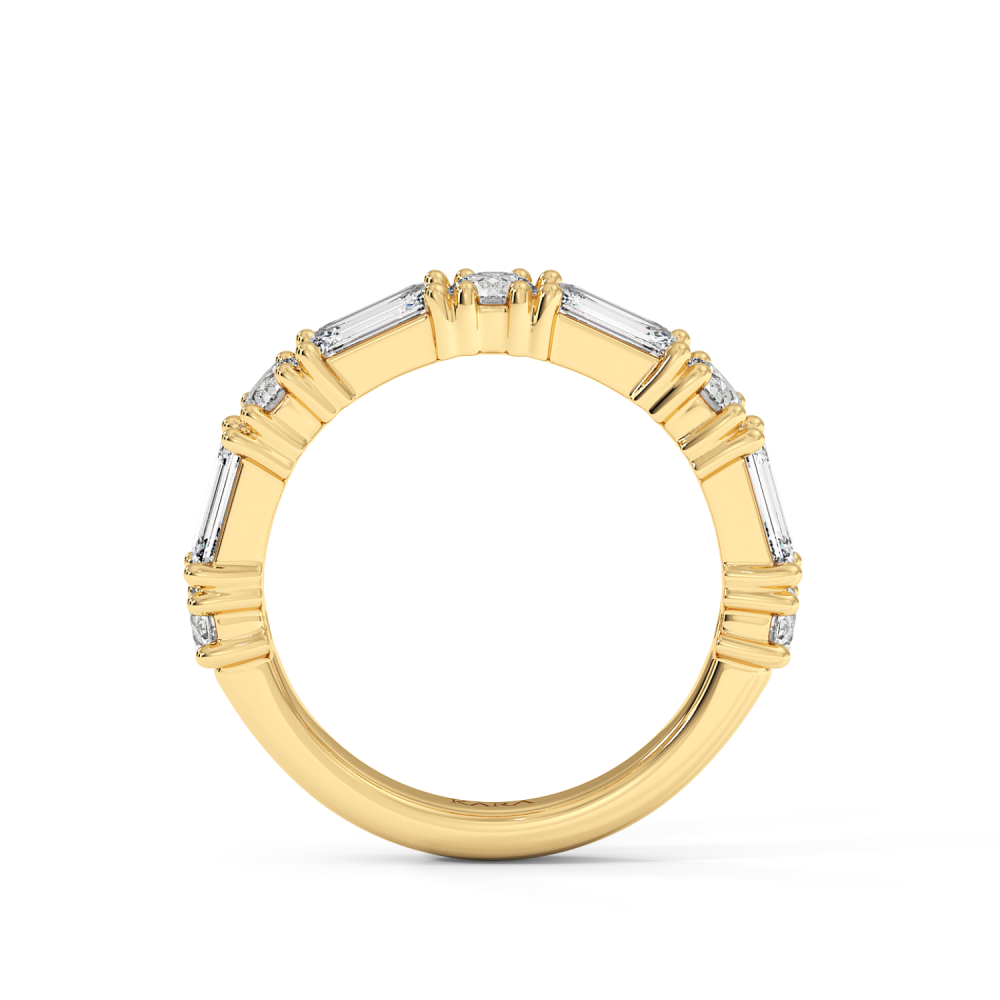 Inel Verigheta Eternity din aur de 14K cu diamante emerald de 1.36 ct si diamante rotunde de 0.715 ct. Greutatea inelului este de aproximativ 4.58 grame.