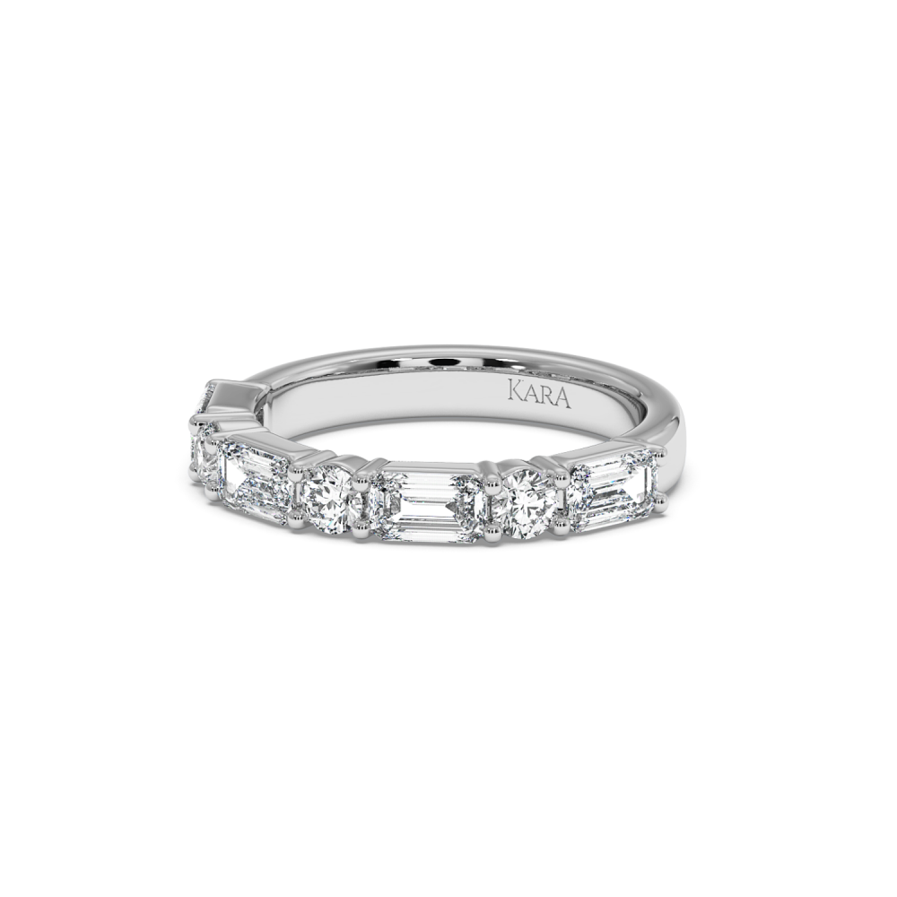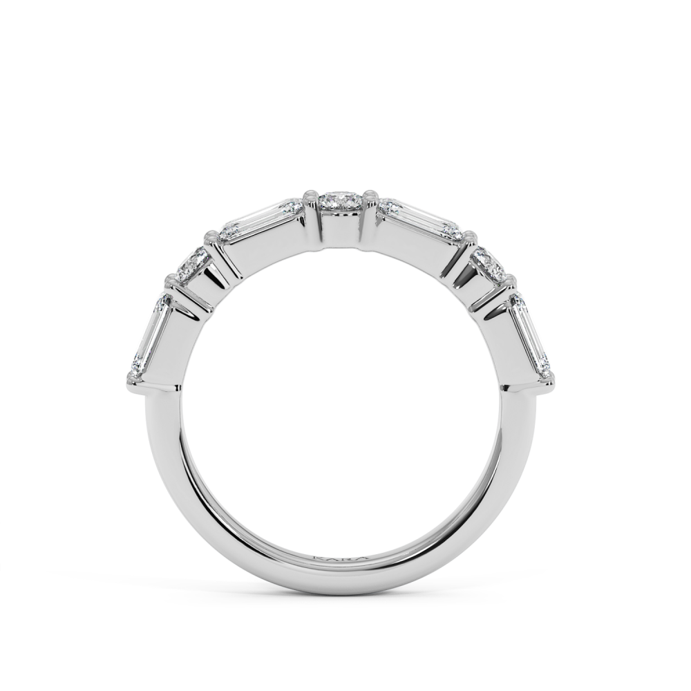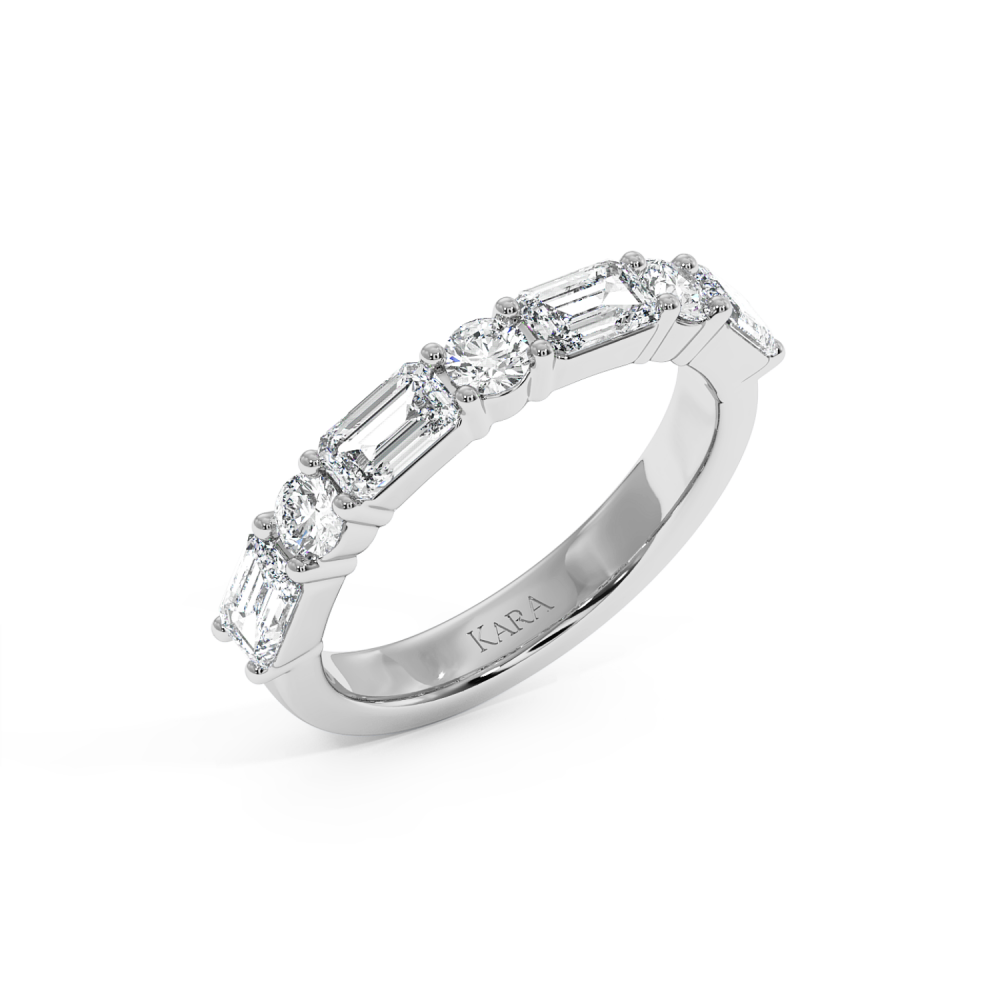 Inelul/Verigheta Eternity din aur alb de 14 K cu diamante Emerald de 1.0ct si diamante rotunde de 0.33ct. Greutatea este de 3.77 grame. Gramajele si caratajele sunt aproximative. Se poate face pe comanda si din aur de 18K. Putem modifica designul in functie de bugetul dumneavoastra.