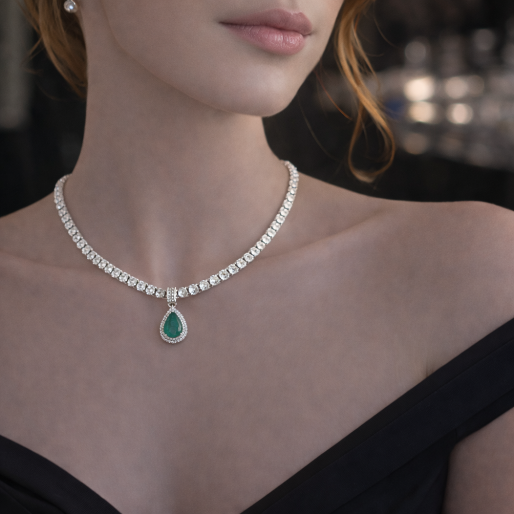 Pandantiv pentru colierul tennis din aur alb de 14K, cu Diamante de 0.61 ct si Smarald de 1.41 ct. Greutatea pandantului este de 4.24 grame.