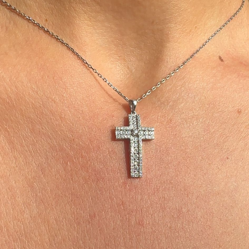 Pandantiv cruciulita din aur alb de 14 K, cu diamante de 0.33 ct. Greutatea este de 4.11 grame.
