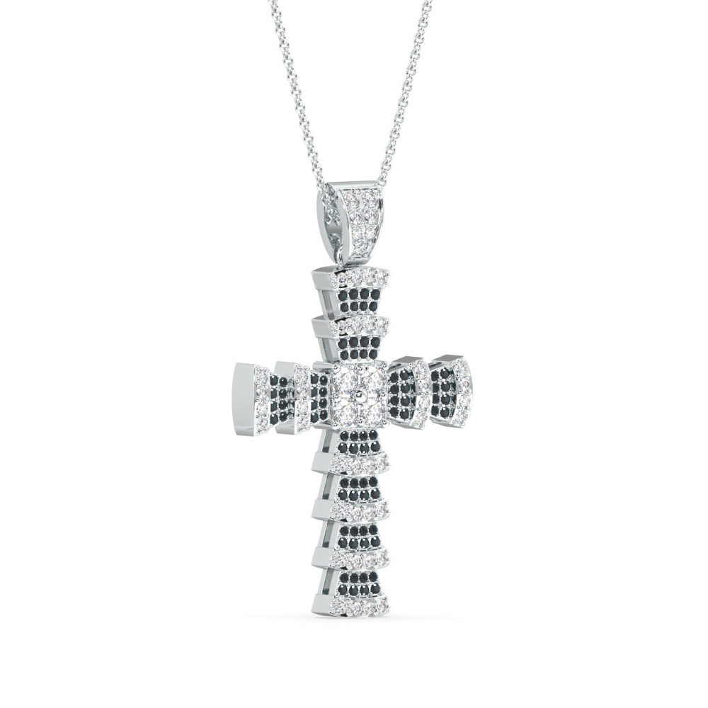 Pandantiv cruciulita din aur alb de 14 K, cu diamante albe de 0.92 ct si diamante negre de 0.35 ct. Greutatea colierului este de aproximativ 14 grame.