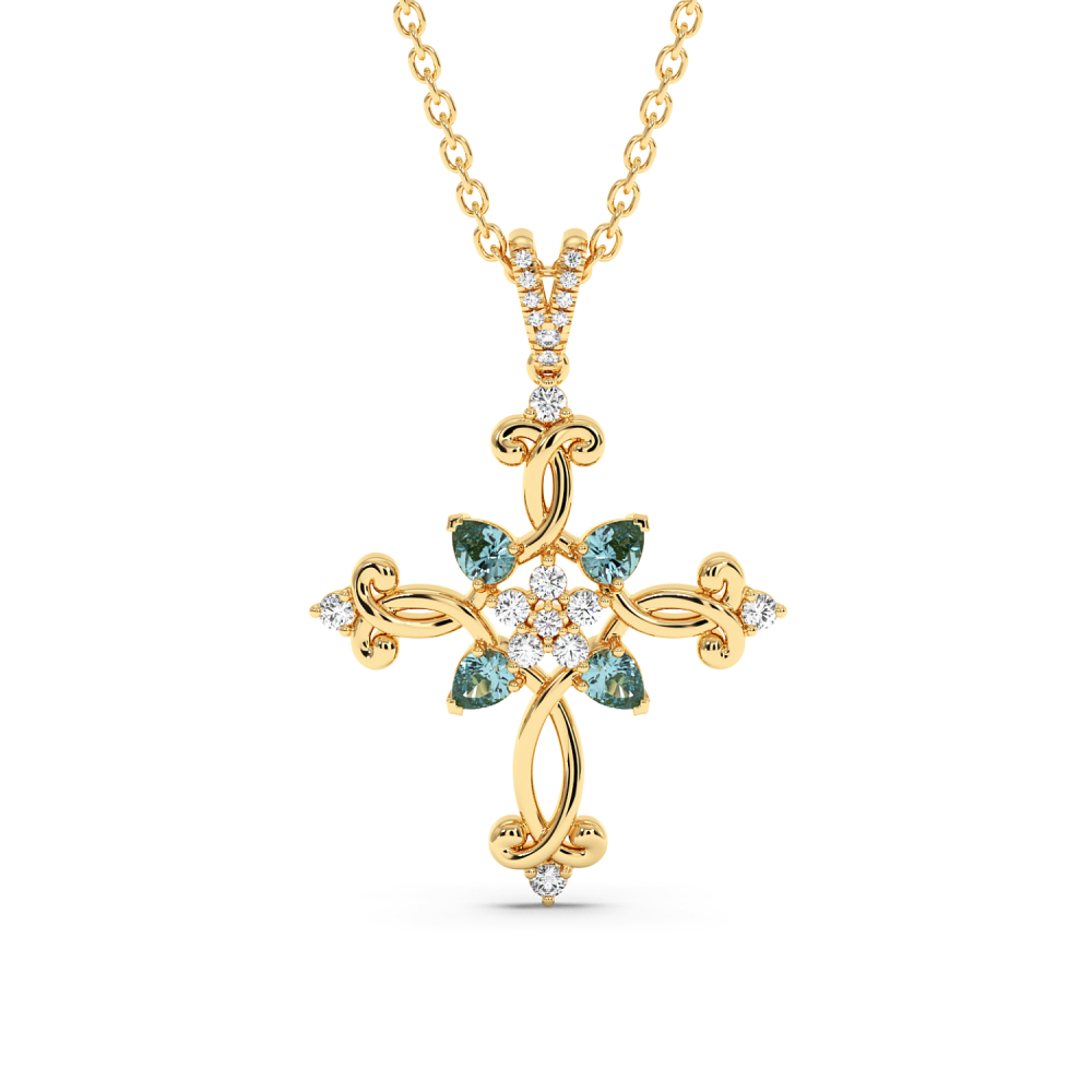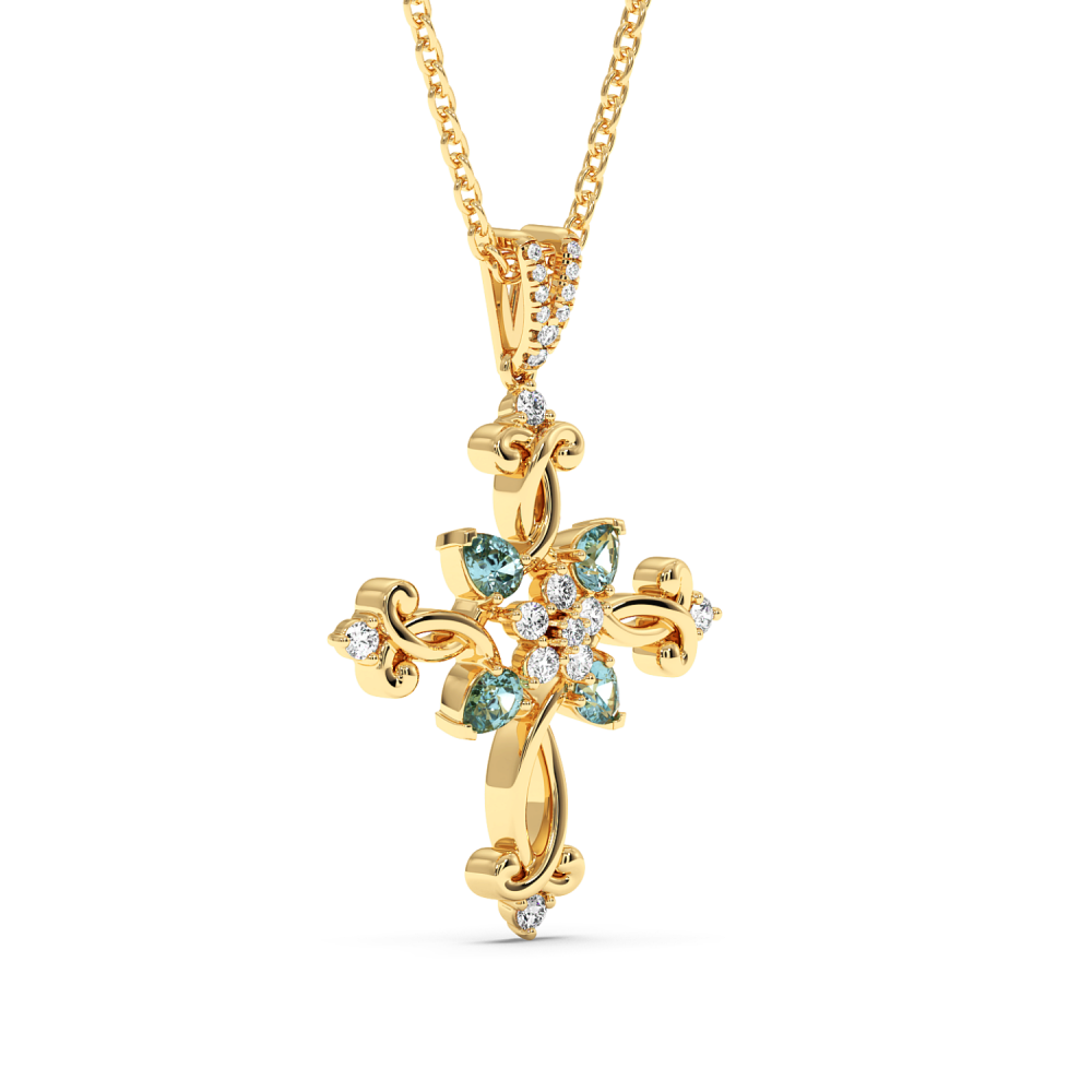 Pandantiv cruciulita din aur de 14 K, cu blue topaz de 0.84ct si diamante de 0.21ct. Greutatea este de aproximativ 5.67 grame. Accesati "SPECIFICATII" pentru mai multe detalii despre acest produs.