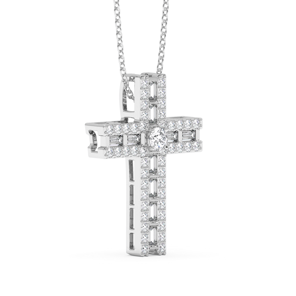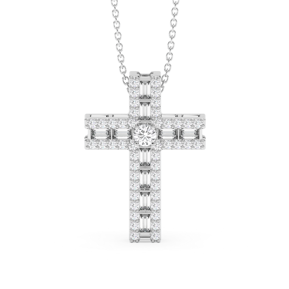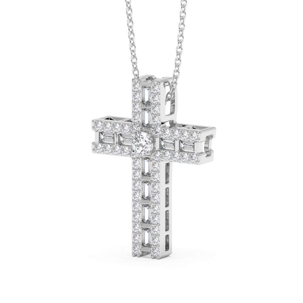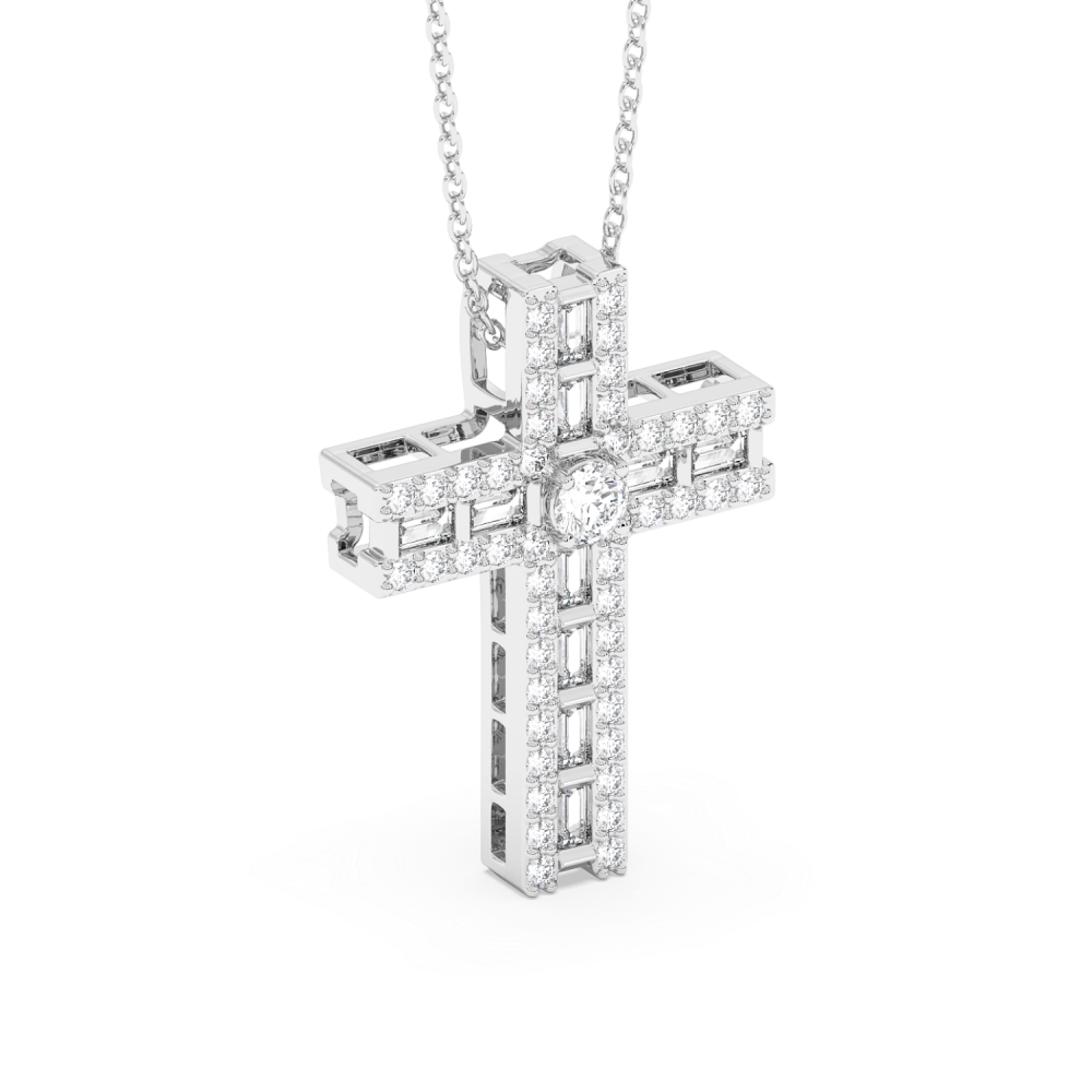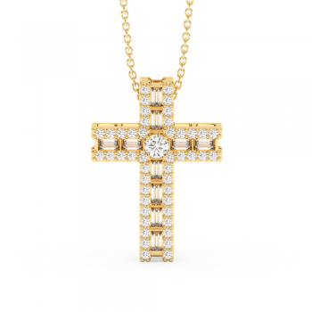 Pandantiv cruciulita din aur de 14 K, cu diamante central rotund de 0.13ct, diamante baget de 0.39ct si diamante rotunde de 0.39ct. Greutatea cruciulitei este de aproximativ 2.20 grame. Accesati "SPECIFICATII" pentru mai multe detalii despre acest produs.
