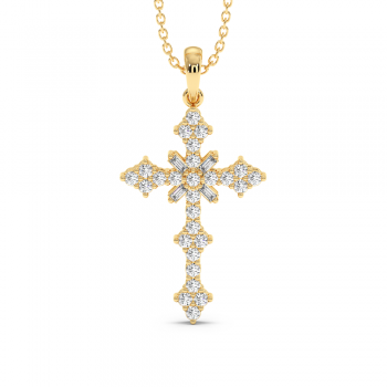 Pandantiv cruciulita din aur de 14 K, cu diamante baget de 0.07ct si diamante rotunde de 0.44ct. Greutatea cruciulitei este de aproximativ 1.84 grame. Accesati  "SPECIFICATII" pentru mai multe detalii despre acest produs.