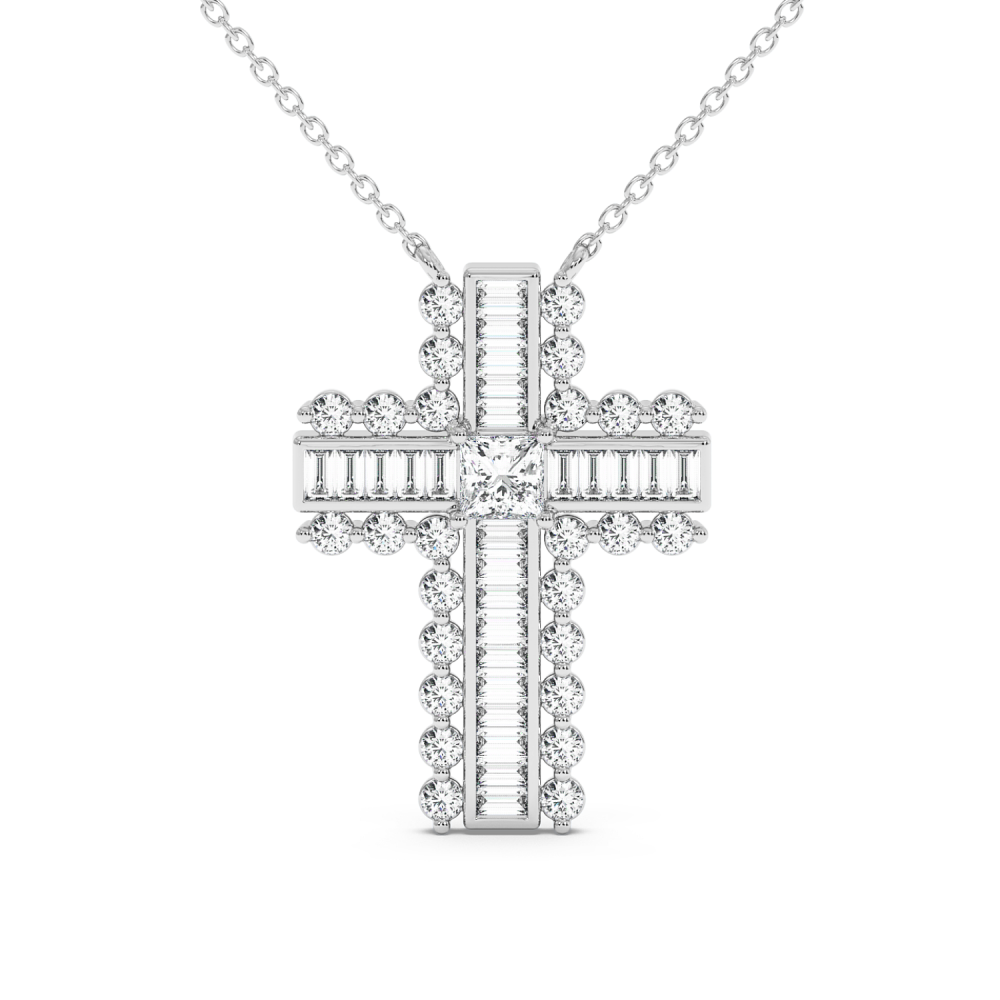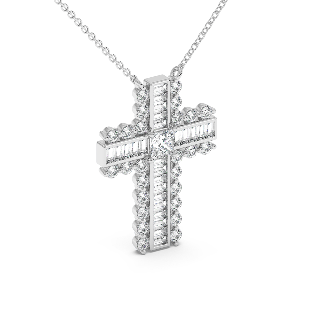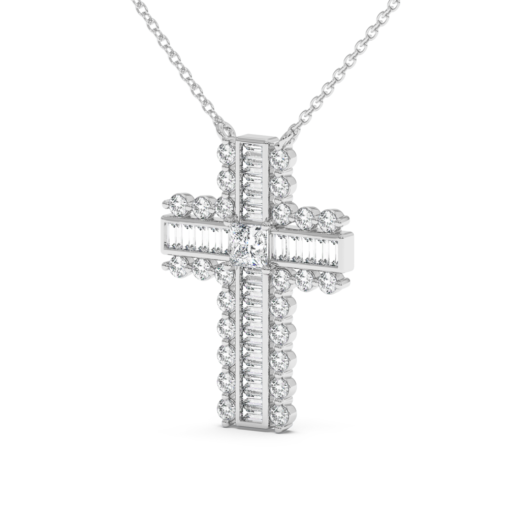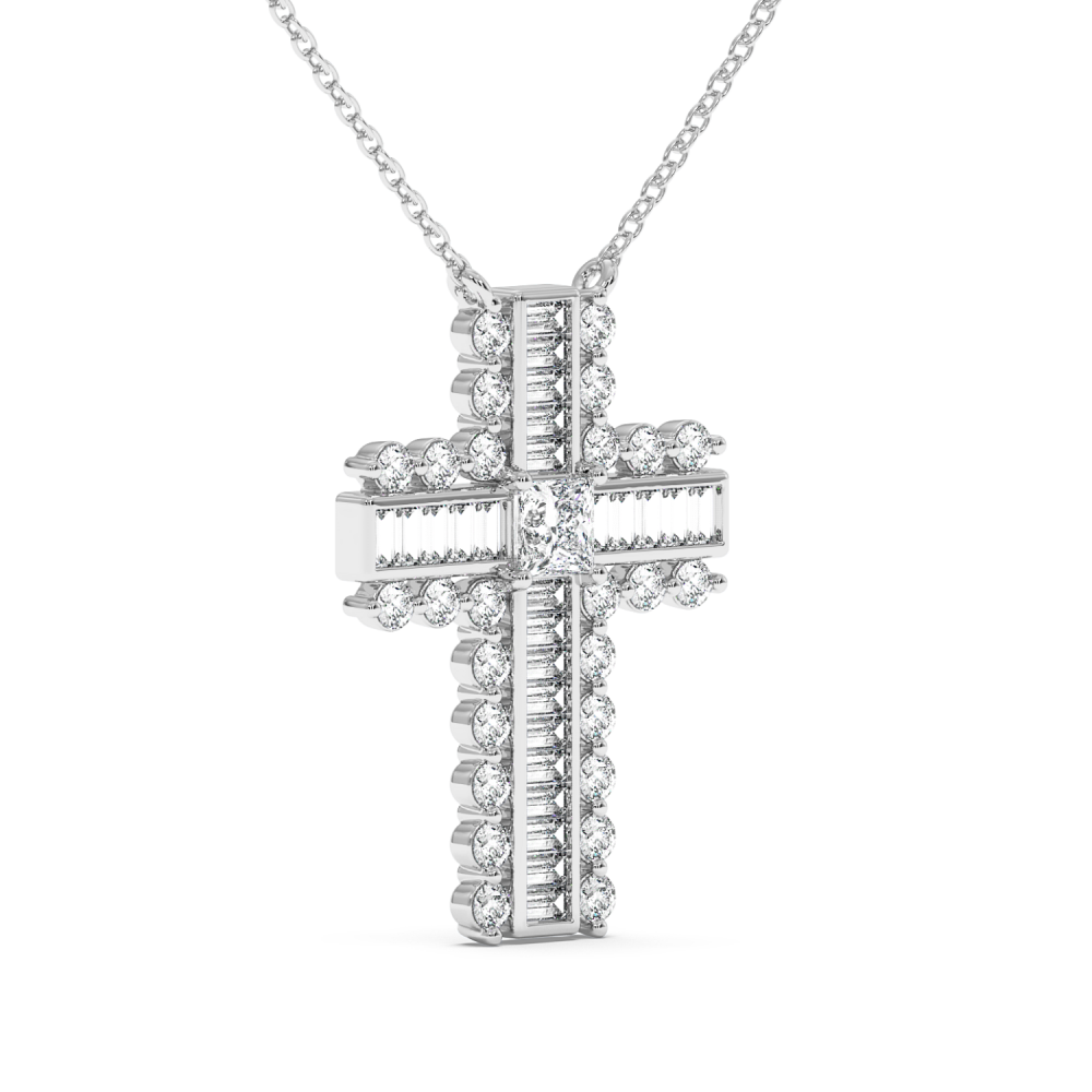 Pandantiv cruciulita din aur de 14 K, cu Diamante Baget de 0.32 ct, Diamante Princess de 0,20 ct si Diamante Rotunde de 0.47 ct. Greutatea cruciulitei este de aproximativ 3,7 grame. Accesati "SPECIFICATII" pentru mai multe detalii despre acest produs.
