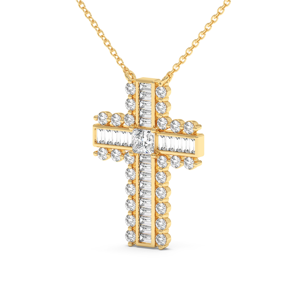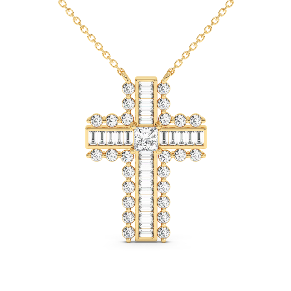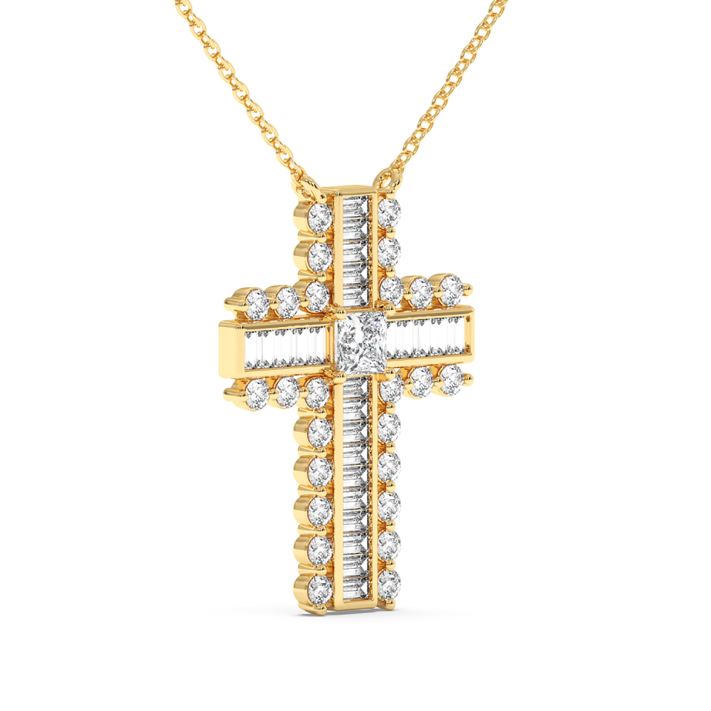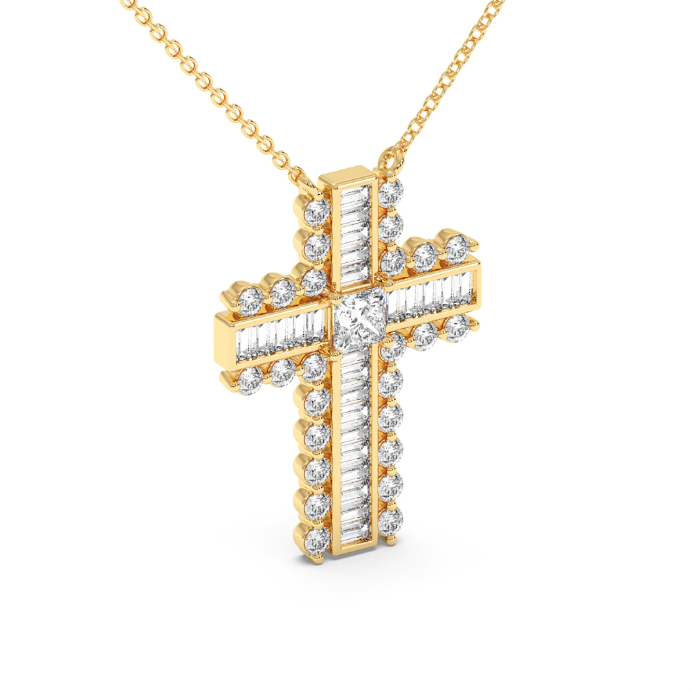 Pandantiv cruciulita din aur de 14 K, cu Diamante Baget de 0.32 ct, Diamante Princess de 0,20 ct si Diamante Rotunde de 0.47 ct. Greutatea cruciulitei este de aproximativ 3,7 grame.