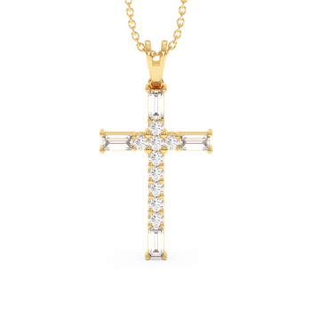 Pandantiv cruciulita din aur de 14 K, cu diamante baget de 0.44ct si diamante rotunde de 0.31ct. Greutatea cruciulitei este de aproximativ 1.80 grame. Accesati "SPECIFICATII" pentru mai multe detalii despre acest produs.