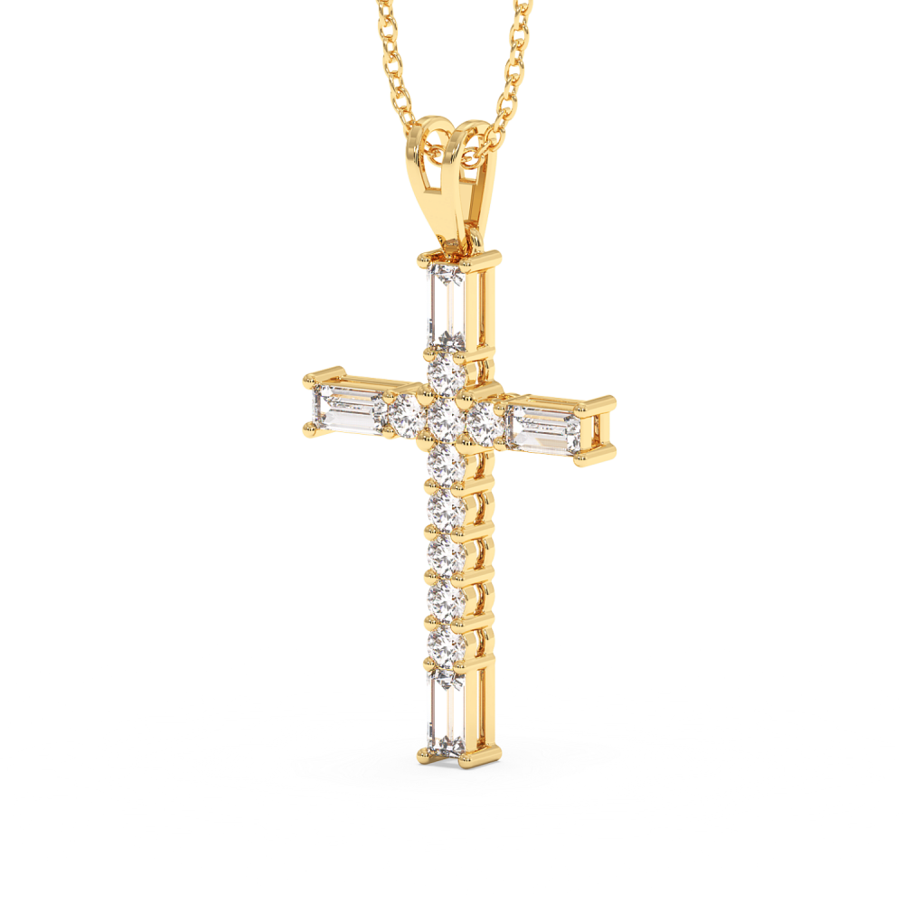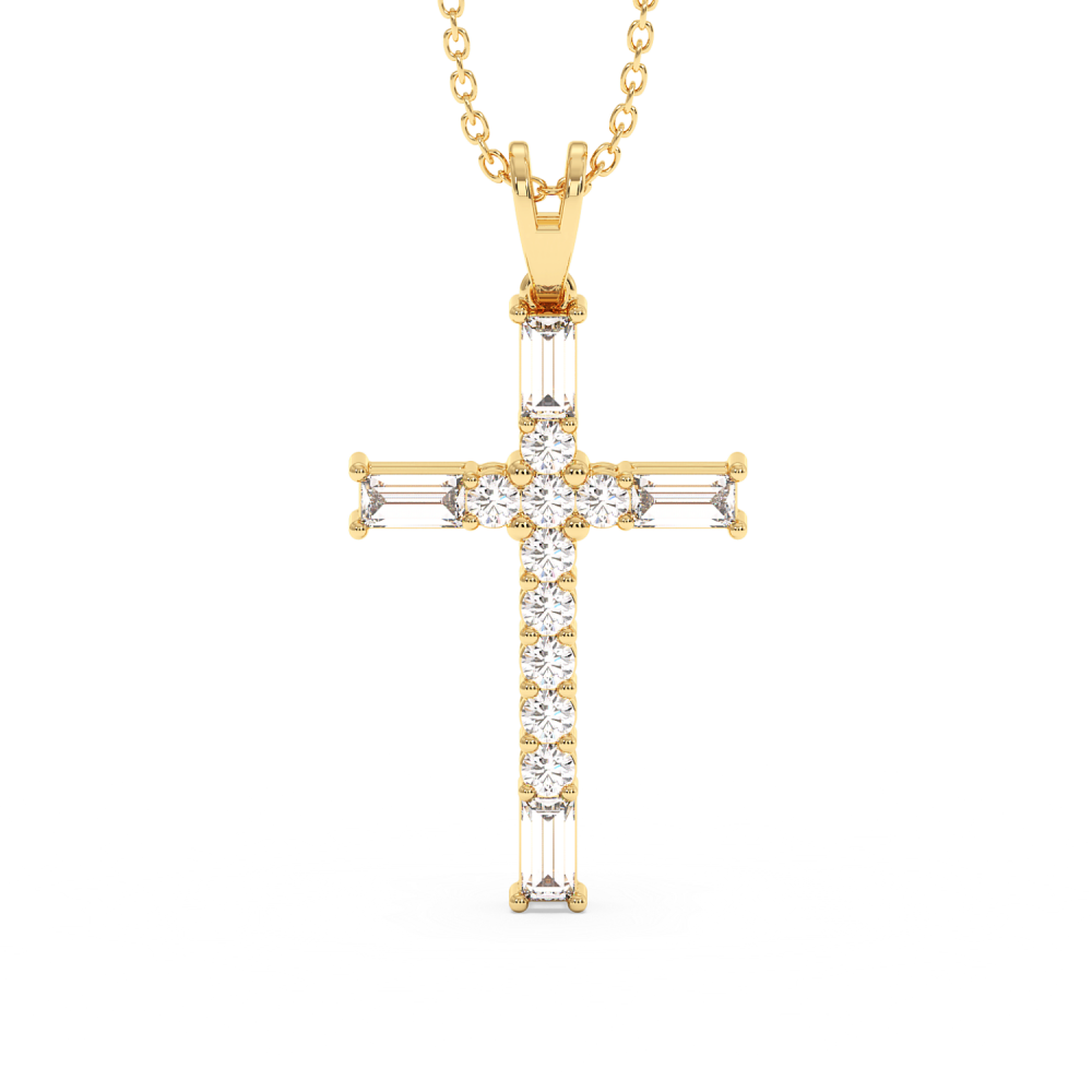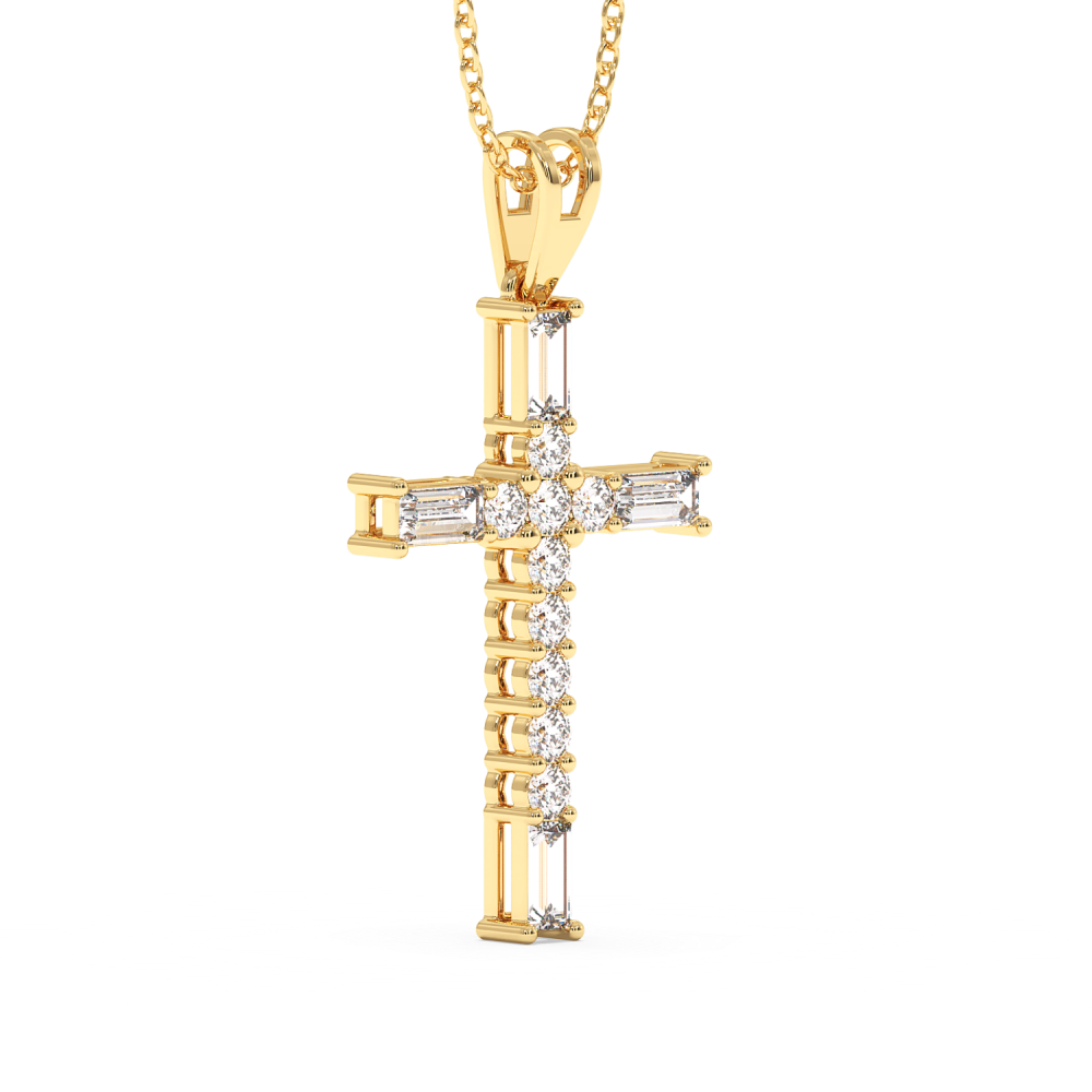 Pandantiv cruciulita din aur de 14 K, cu diamante baget de 0.44ct si diamante rotunde de 0.31ct. Greutatea cruciulitei este de aproximativ 1.80 grame. Accesati "SPECIFICATII" pentru mai multe detalii despre acest produs.