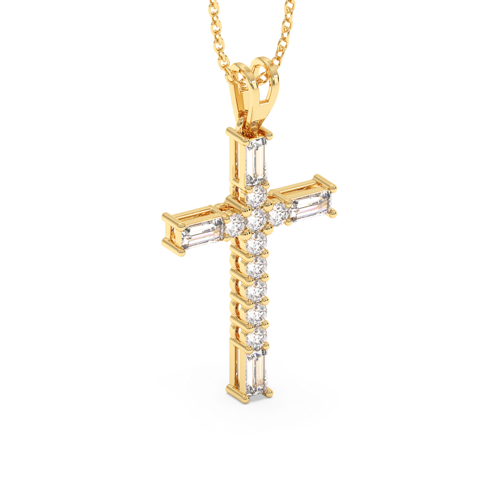 Pandantiv cruciulita din aur de 14 K, cu diamante baget de 0.44ct si diamante rotunde de 0.31ct. Greutatea cruciulitei este de aproximativ 1.80 grame.