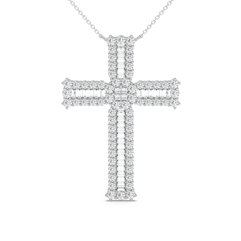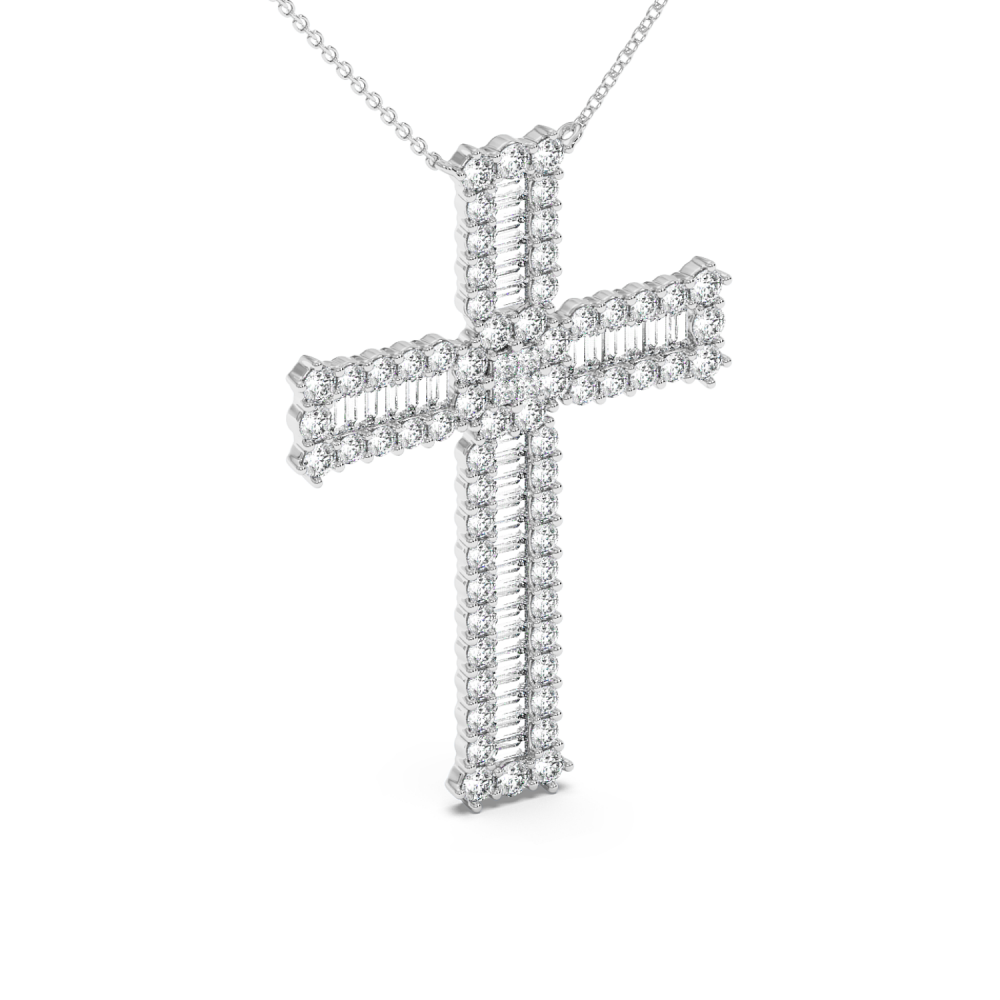 Pandantiv cruciulita din aur de 14 K, cu Diamante Baget de 0.50 ct, Diamante Princess de 0,08 ct si Diamante Rotunde de 1,82 ct. Greutatea cruciulitei este de aproximativ 6,20 grame.