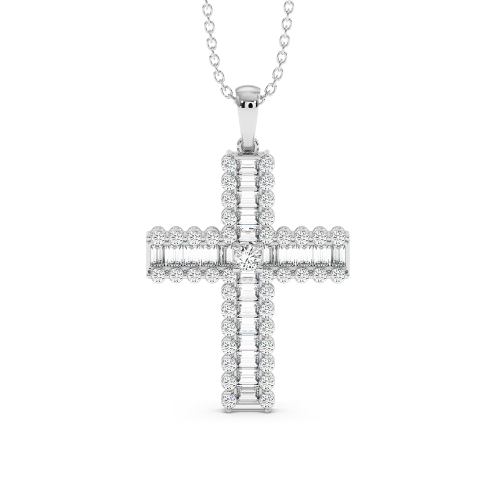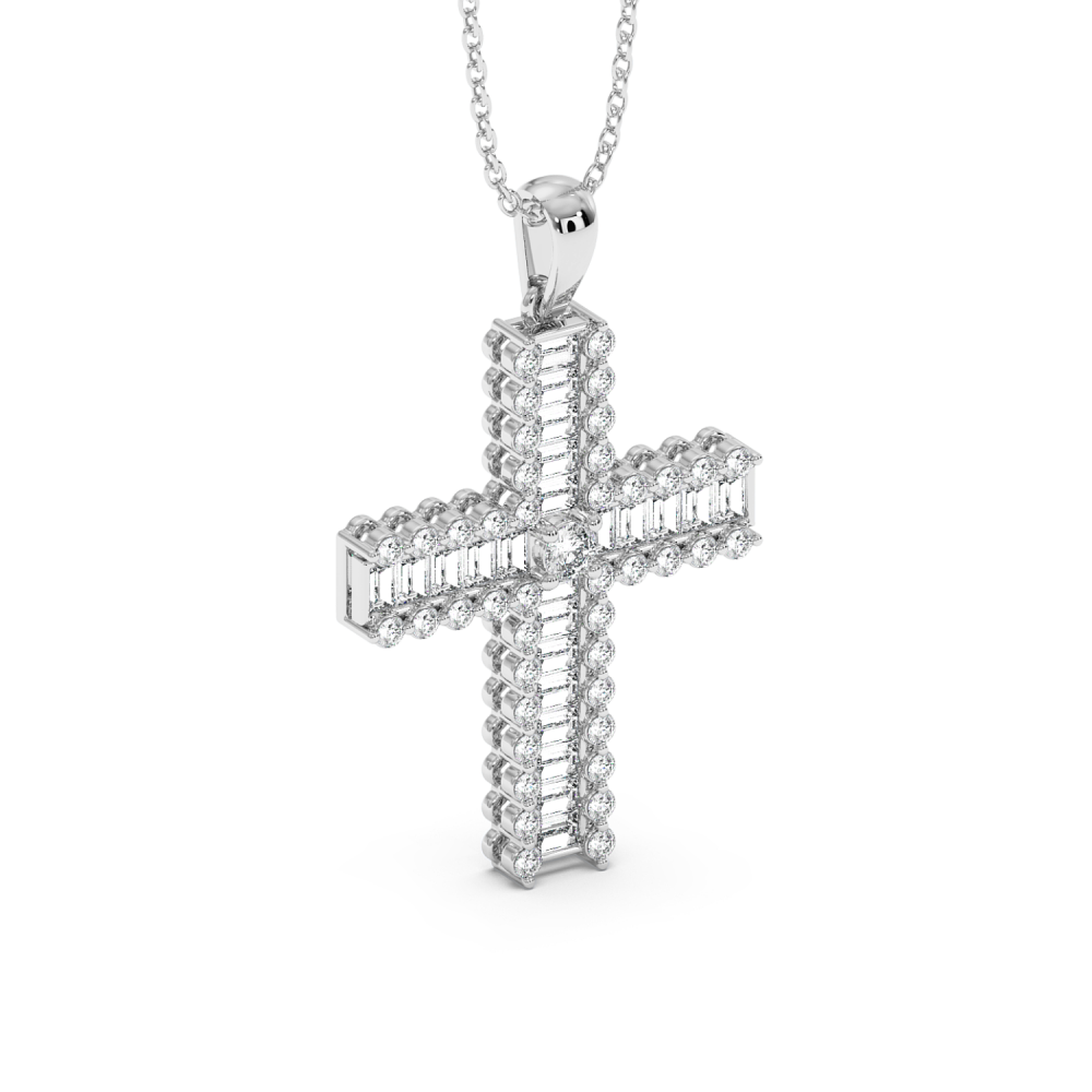 Pandantiv cruciulita din aur de 14 K, cu diamante baget de 0.53ct si diamante rotunde de 0.62ct. Greutatea cruciulitei este de aproximativ 4.80 grame.